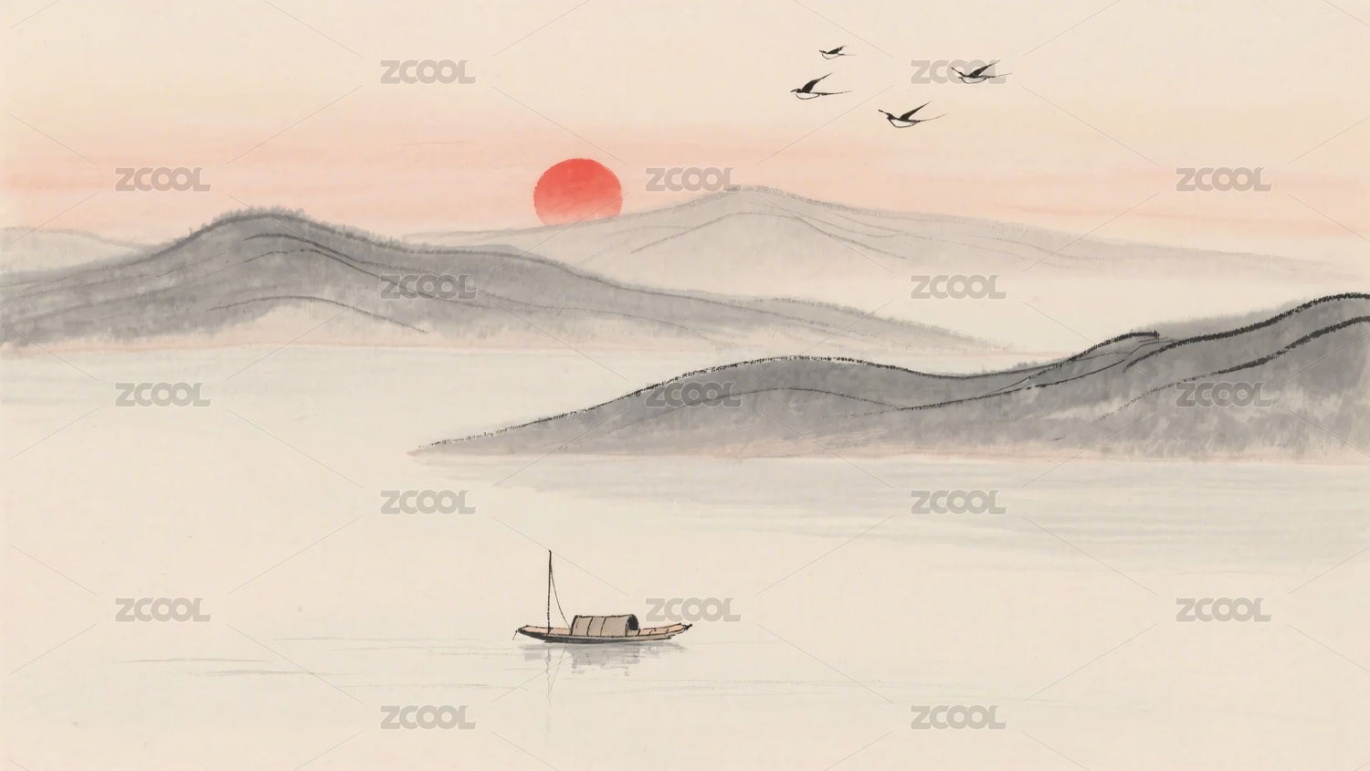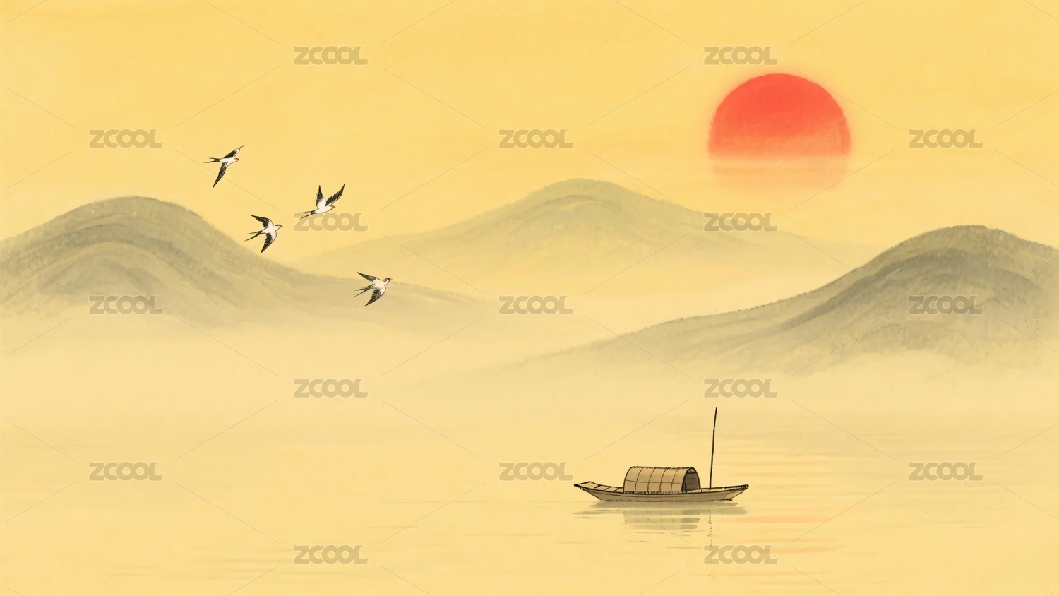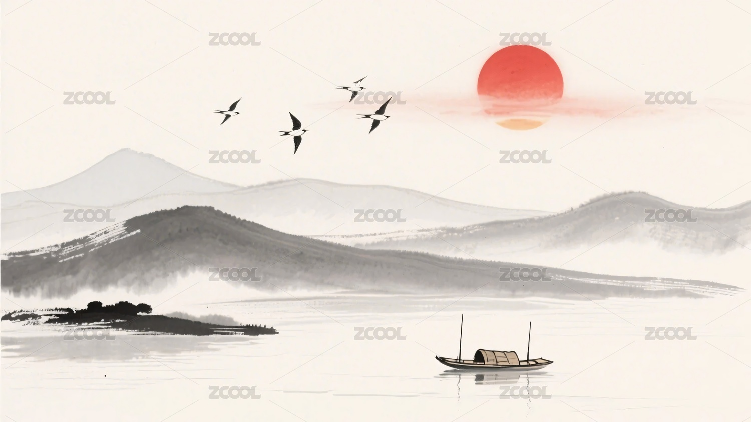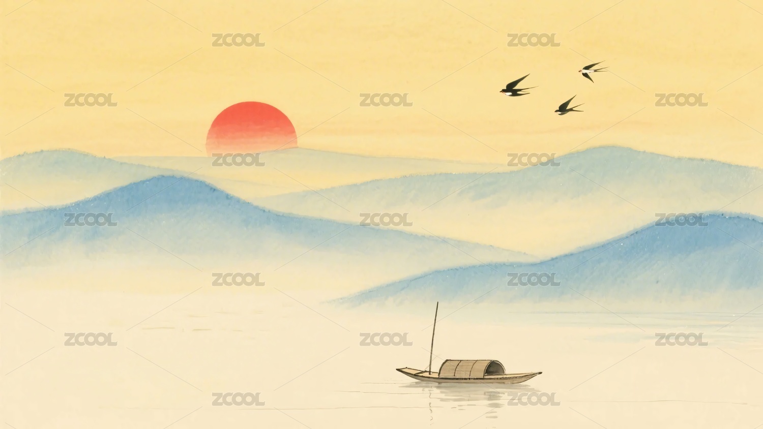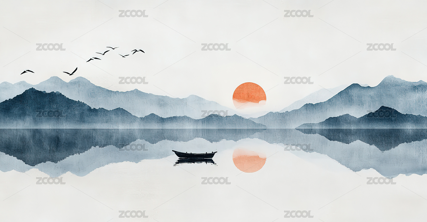 山水,落日,飞鸟,小舟,水墨画,插画,自然,意境,中式,宁静