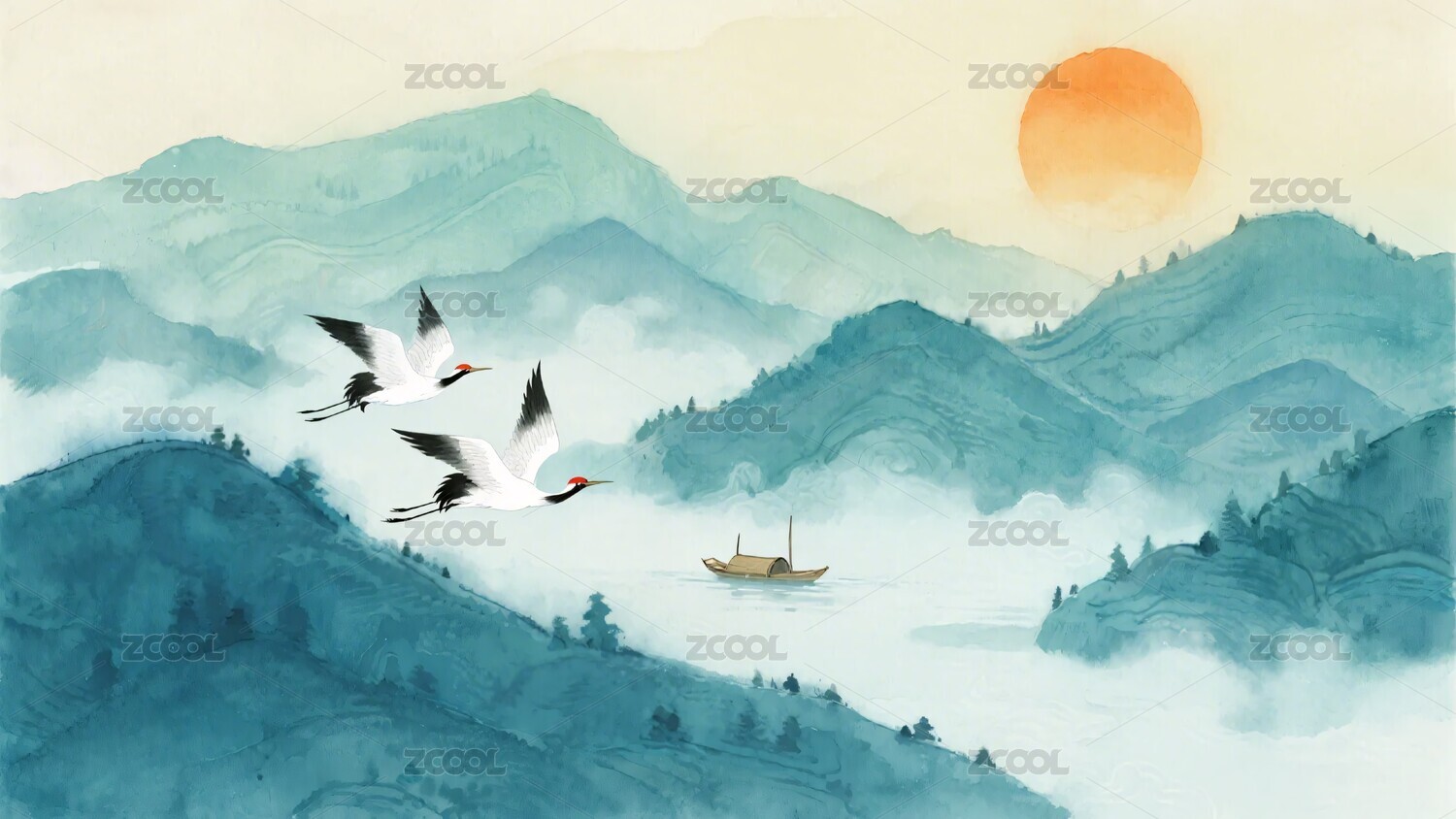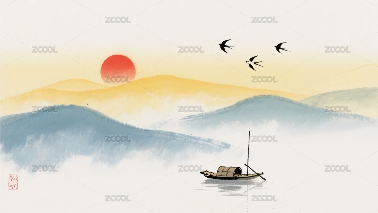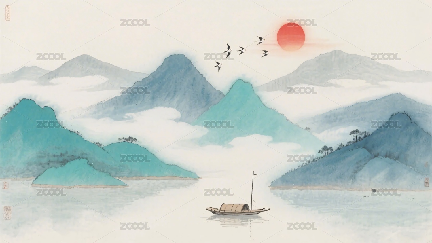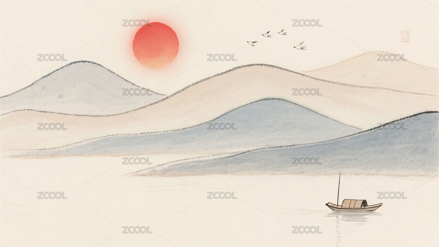 山水,落日,飞鸟,小舟,水墨画,插画,自然,意境,中式,宁静