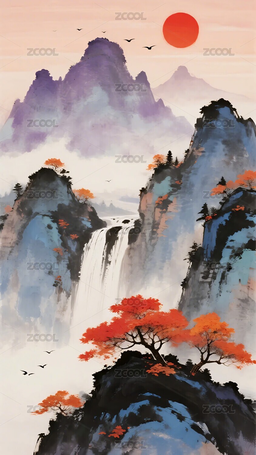 山水,瀑布,红日,飞鸟,树木,插画,自然,风景,意境,中式