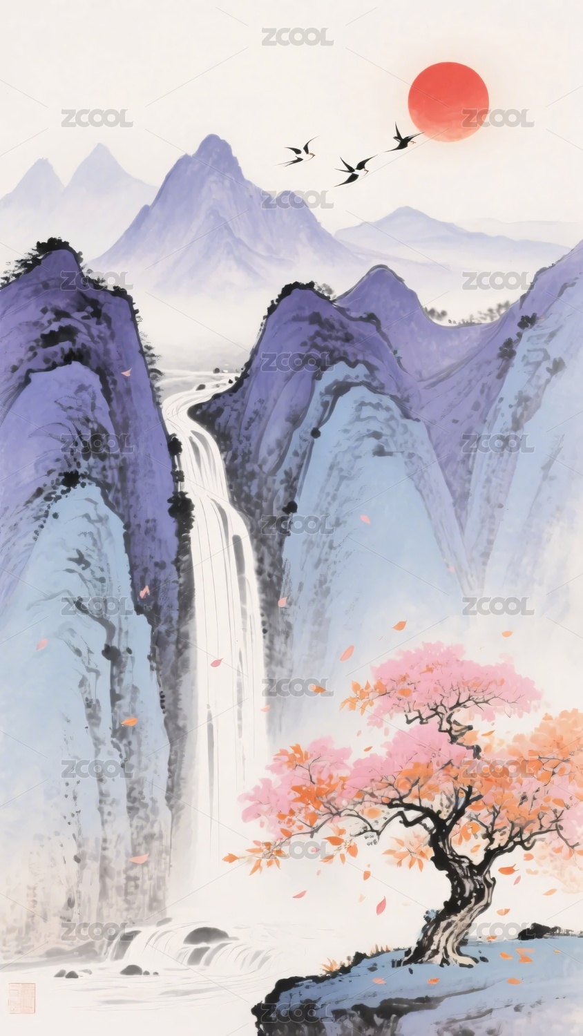 山水,瀑布,红日,飞鸟,树木,插画,风景,中式,自然,元素