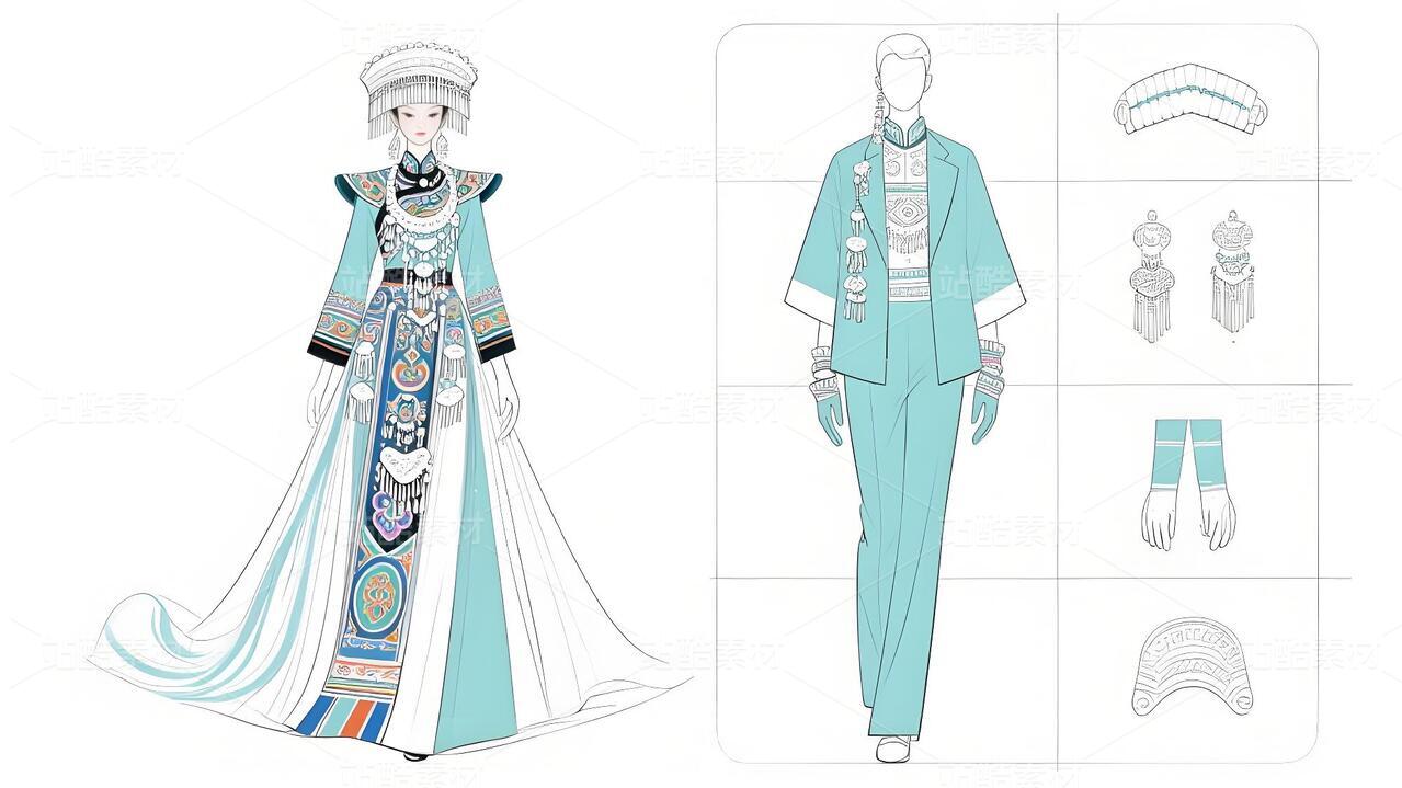 本系列以大理"风花雪月"为意境,选用浅白、浅青、浅蓝三色交织,演绎苍山洱海的空灵之美。设计上将白族传统服饰精髓与现代时尚语言相融合:外套采用立体剪裁,饰以手工桃花刺绣;裤装运用飘逸材质,印染扎染水纹图案;配饰系统重新诠释白族银饰,打造现代感民族风。整套设计既保留了白族服饰的文化识别性,又通过简约廓形和朦胧色系,营造出更具当代审美的高定服饰。在白色背景衬托下,服装的清雅色调与精致细节相得益彰,展现民族时尚的进阶表达。