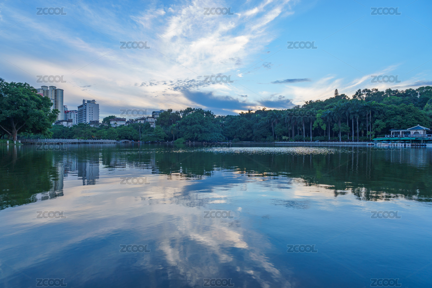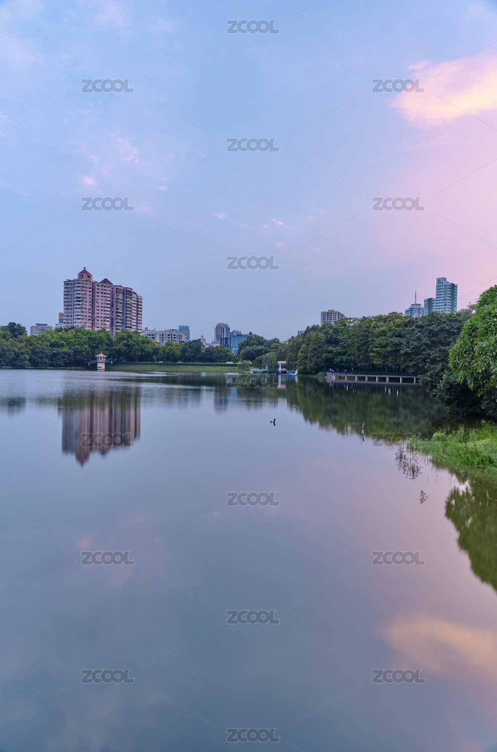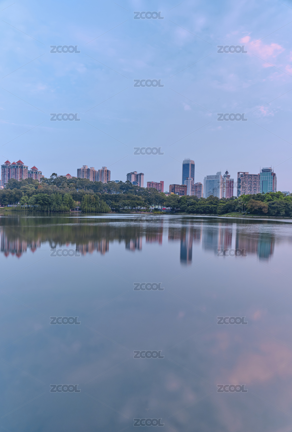 南宁南湖公园城市高楼建筑与湖泊树林倒影