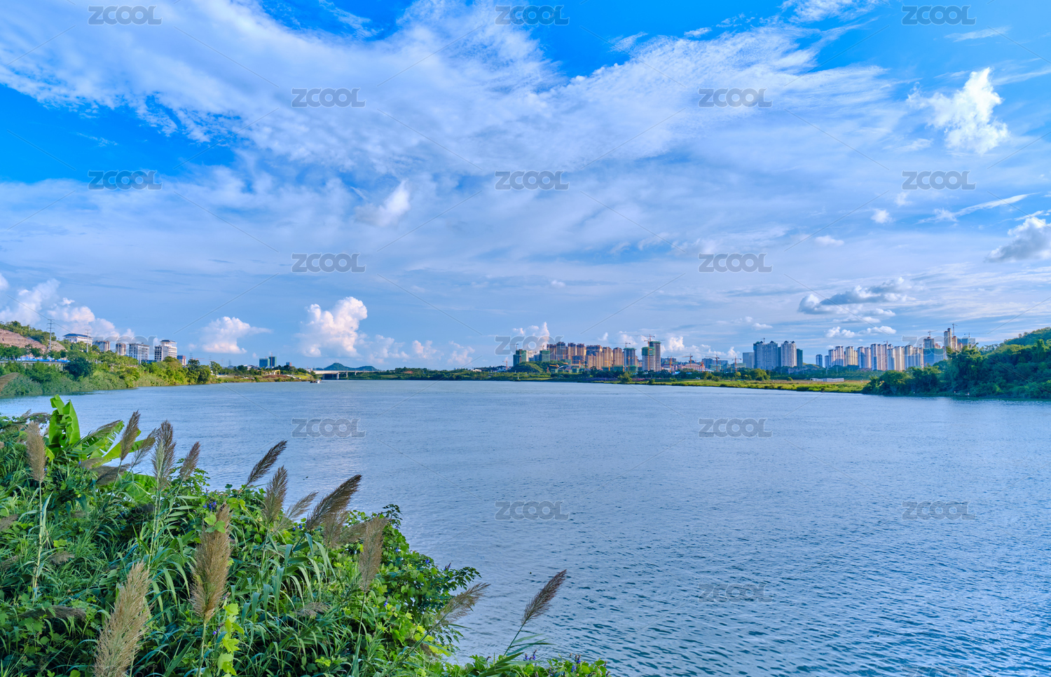南宁南湖公园蓝天白云与城市摩天大楼建筑