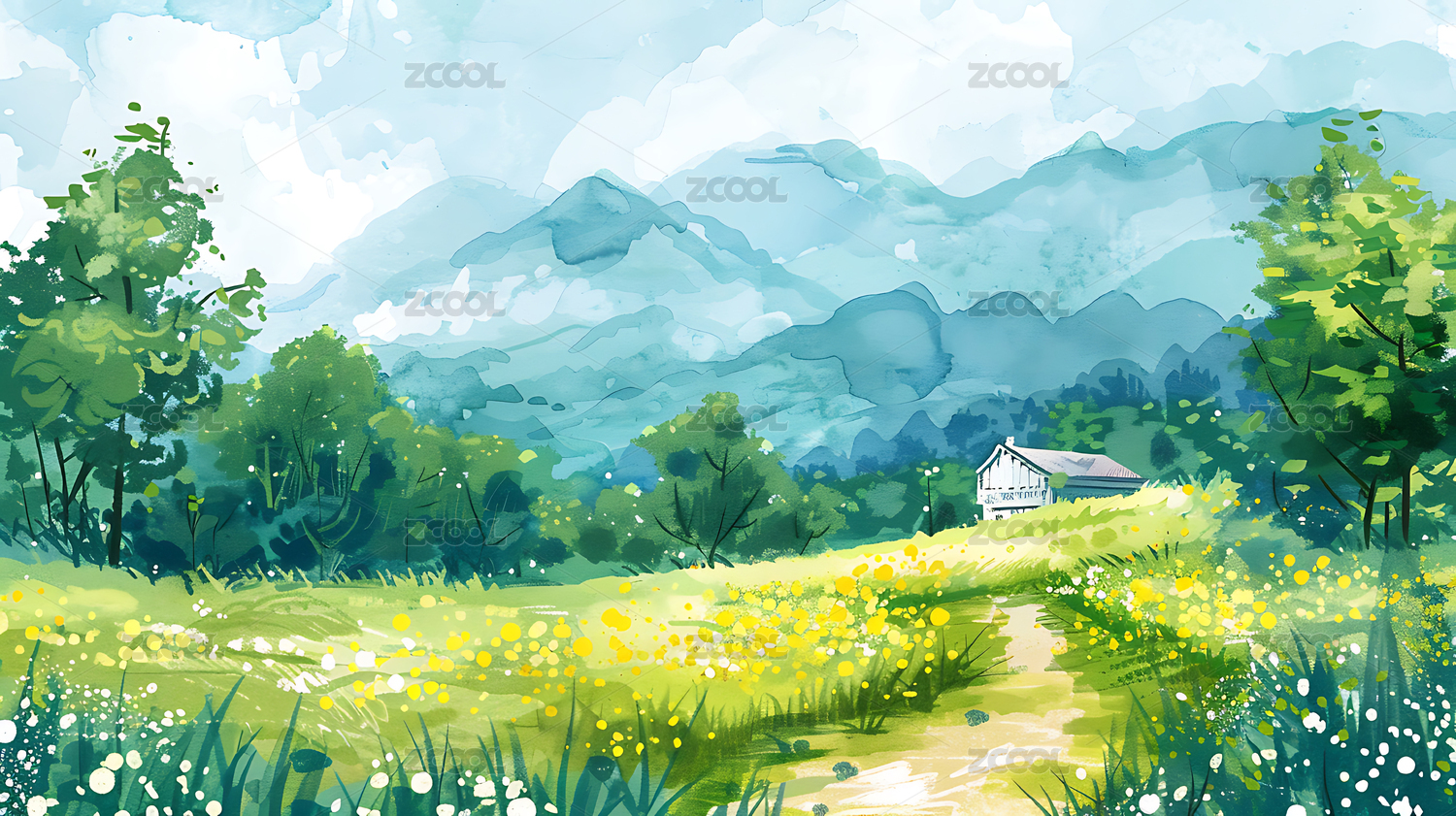 水彩春天风景乡间小路背景装饰画