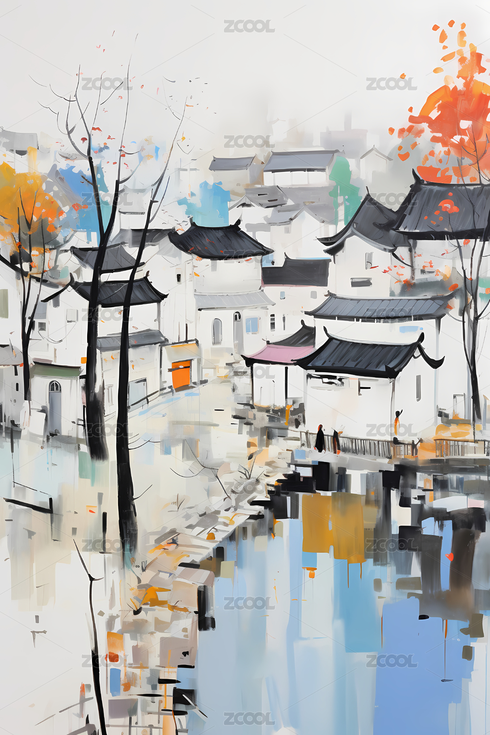 水粉画效果的江南水乡古建筑景观