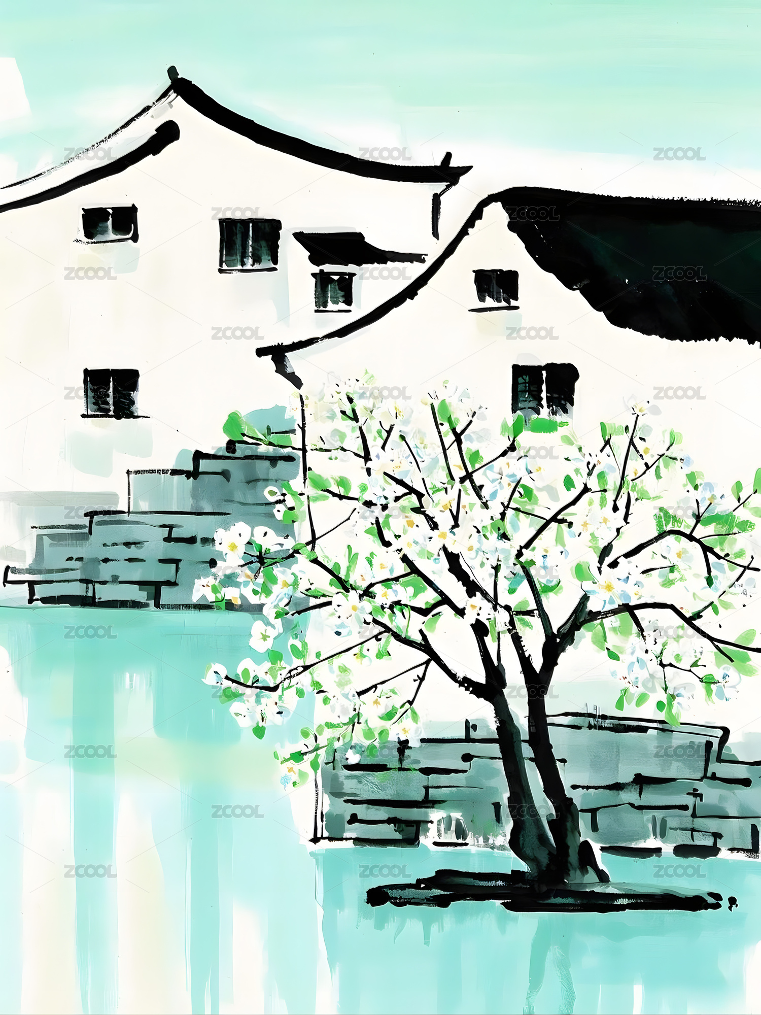 中国水墨画风格江南乡村春天插画,春天村庄