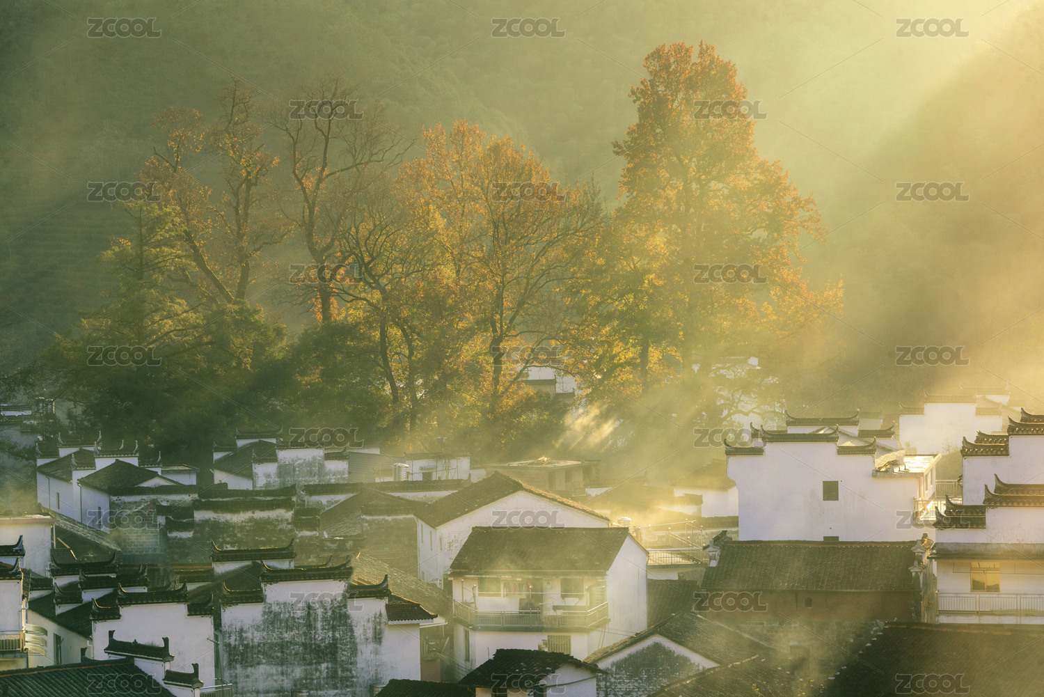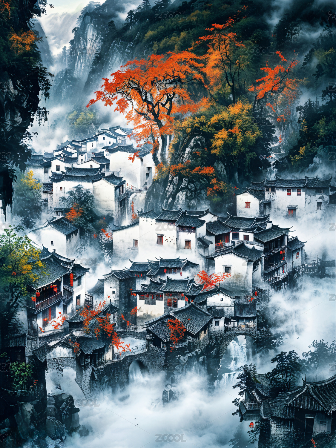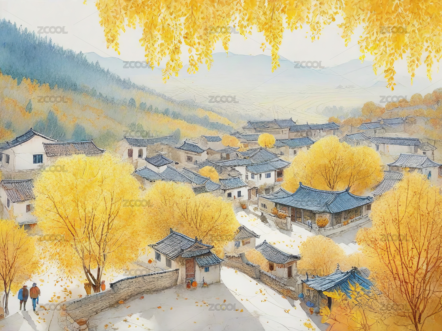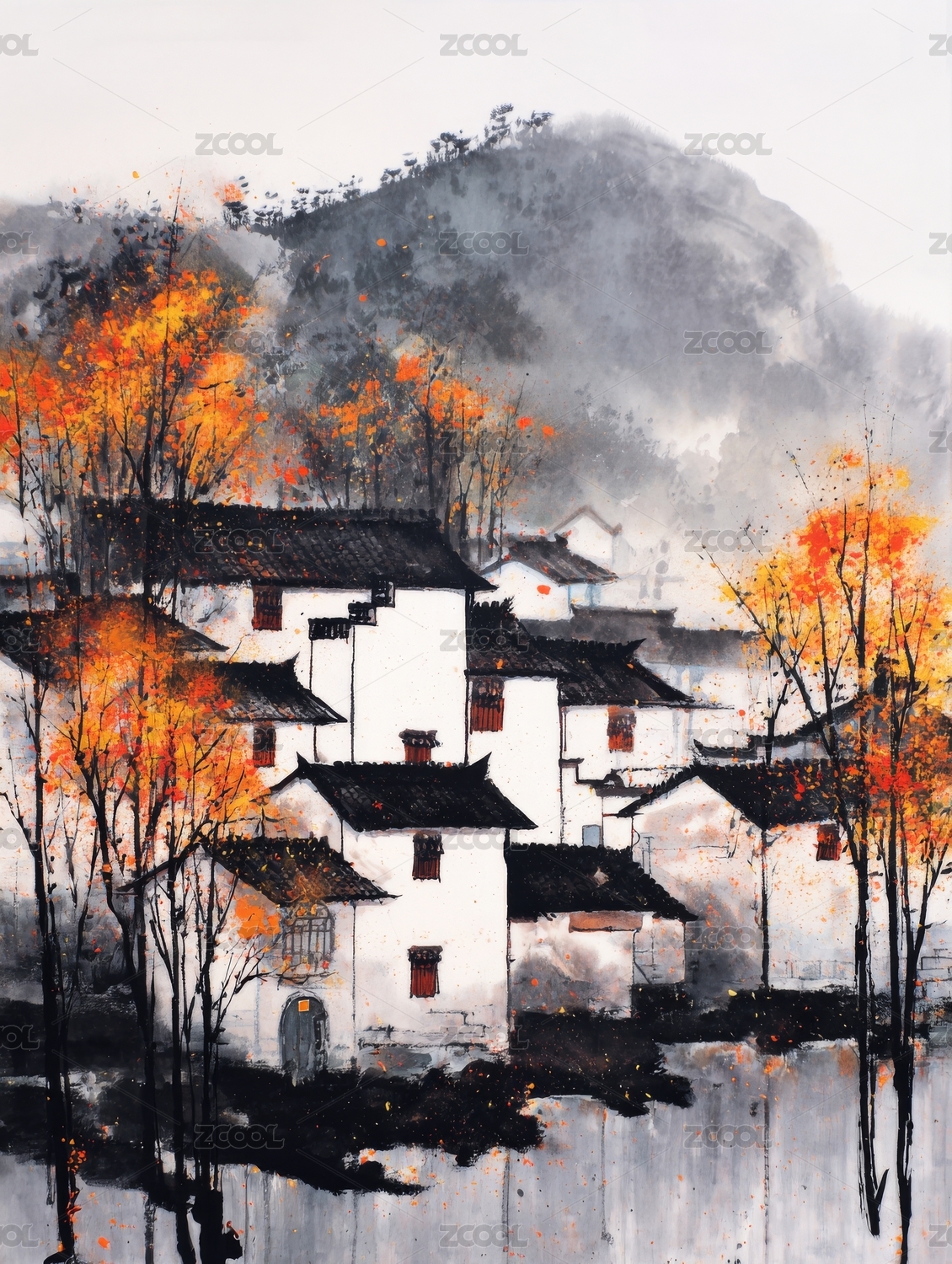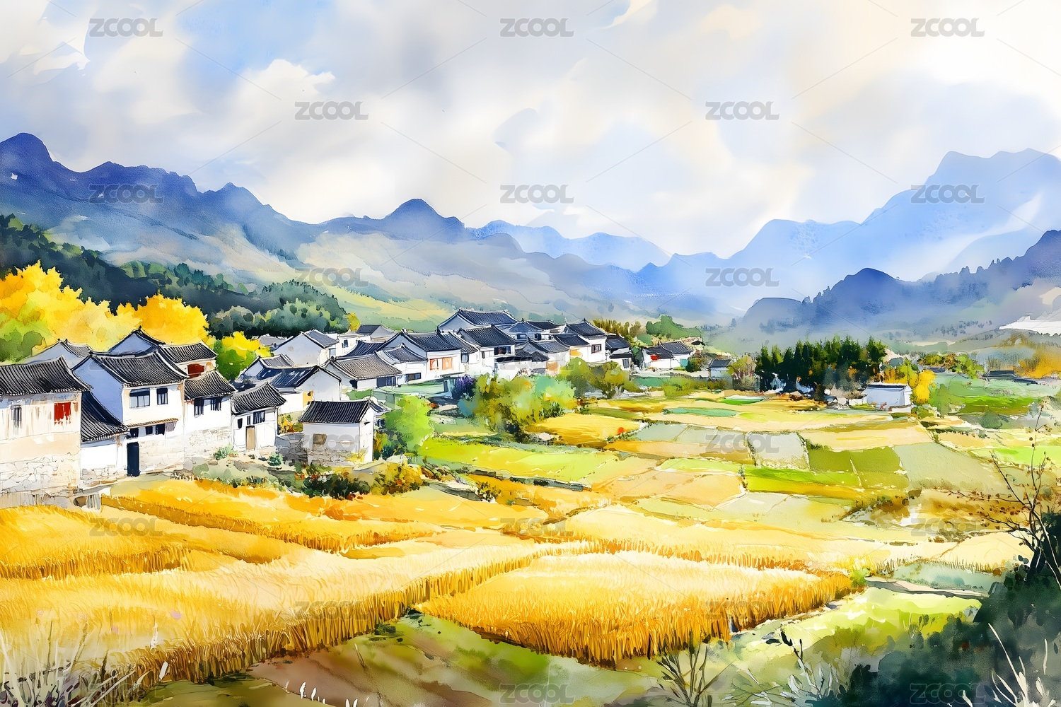 白墙黑瓦的中国传统建筑村庄水彩插画
