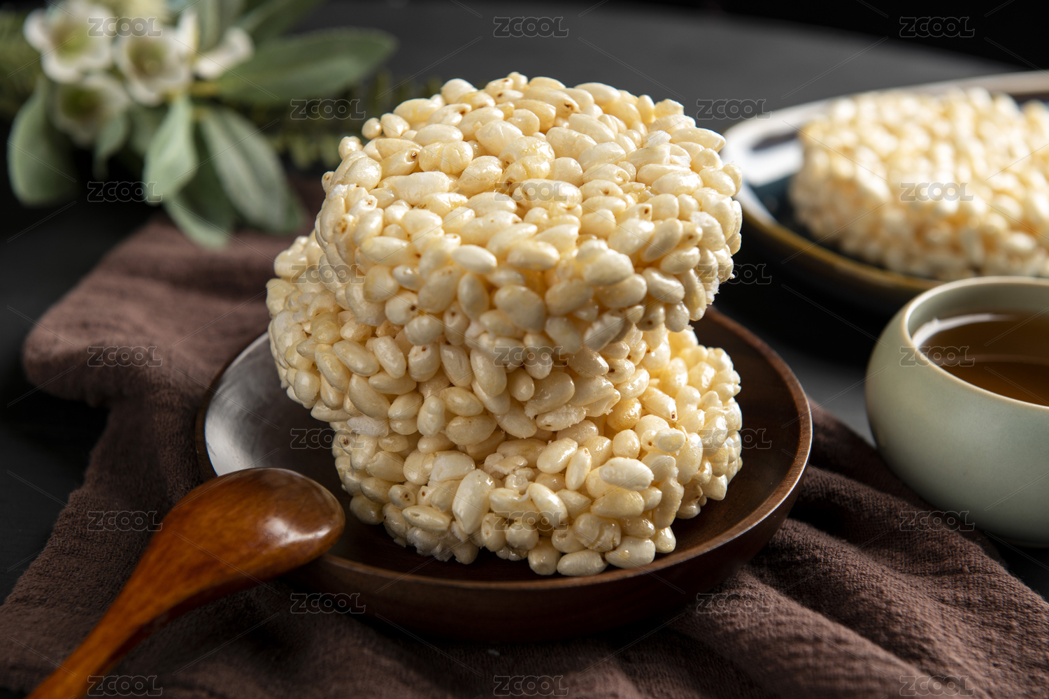米花糖,大米米花糖,圆饼形米花糖,米花糖饼,爆米花,大米,传统小吃,一盘,筷子,茶水