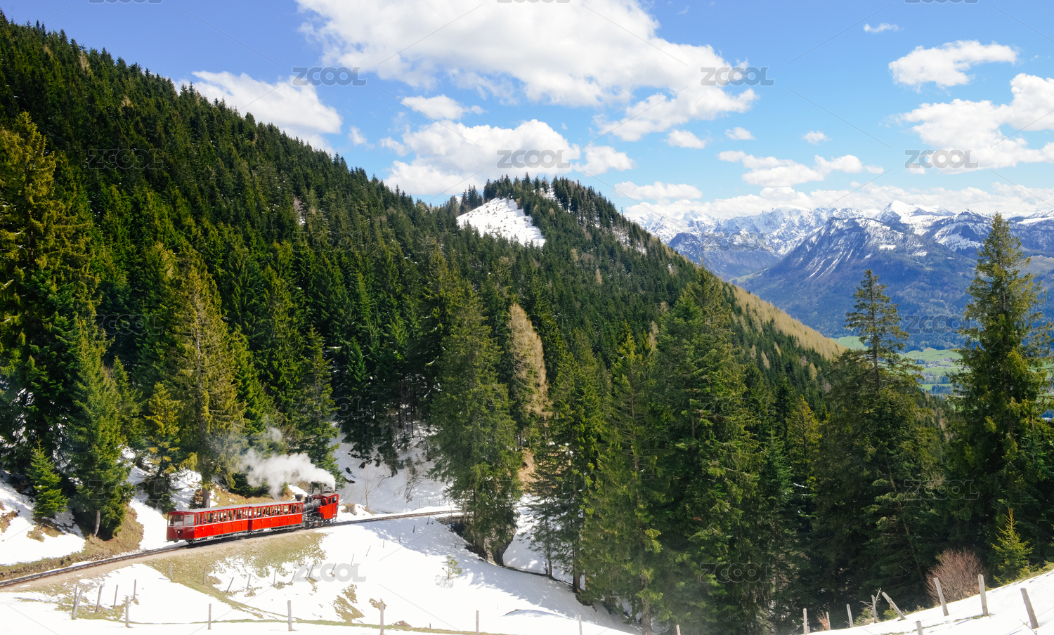 红色小火车行驶在雪山中,夏夫山 (电影《音乐之声》拍摄地) 山脚,奥地利湖区, 欧洲