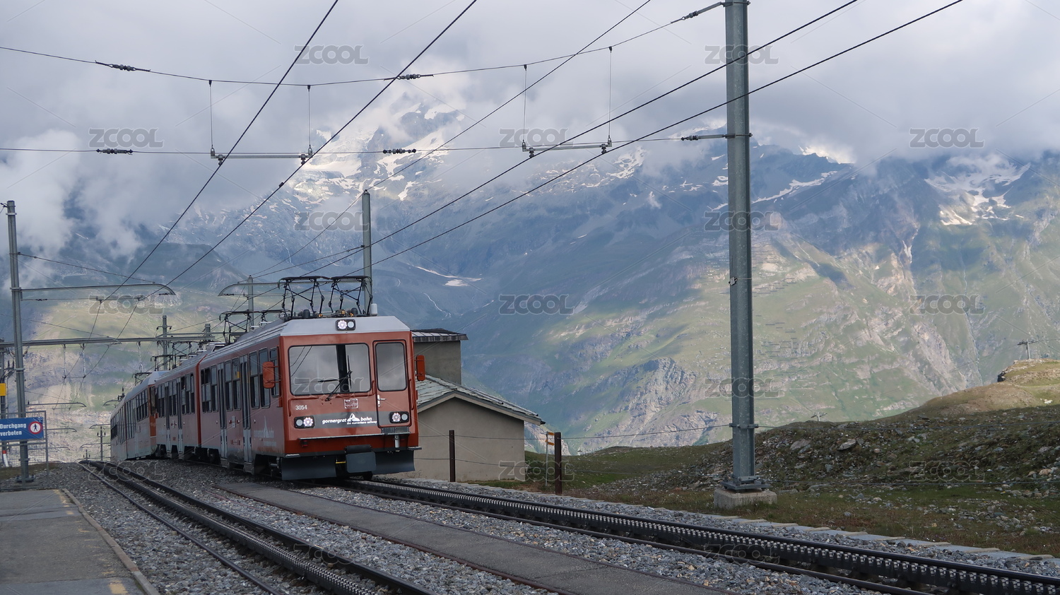 欧洲瑞士采尔马特橘红色冰川列车驶来