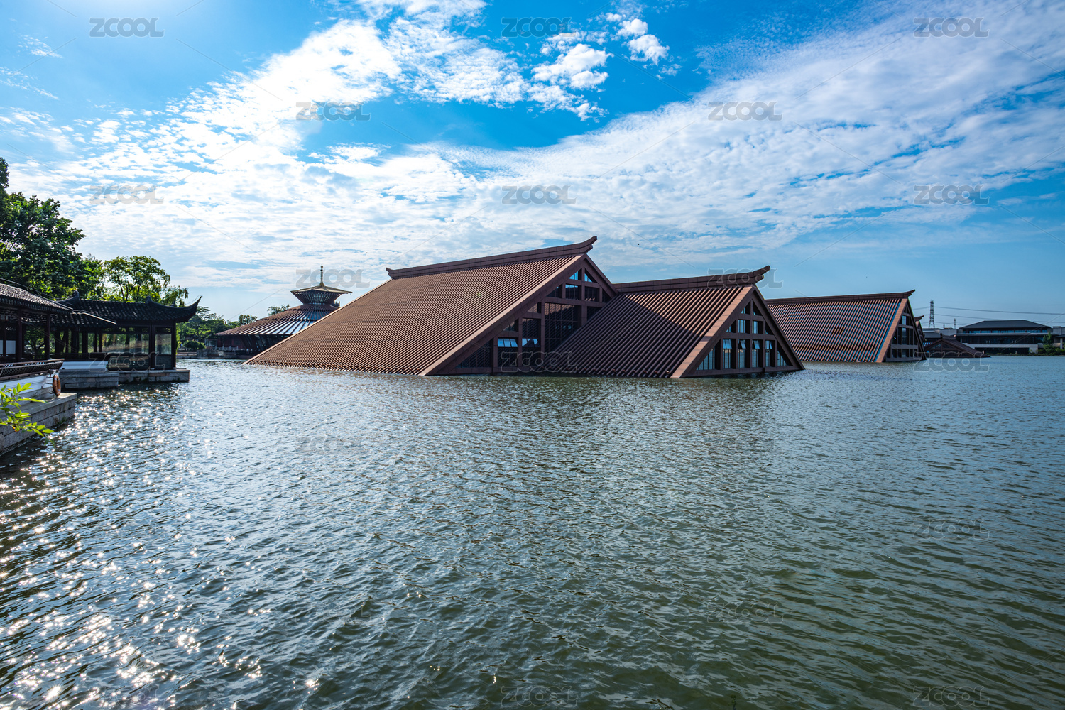 中国上海广富林遗址公园的水上建筑景观