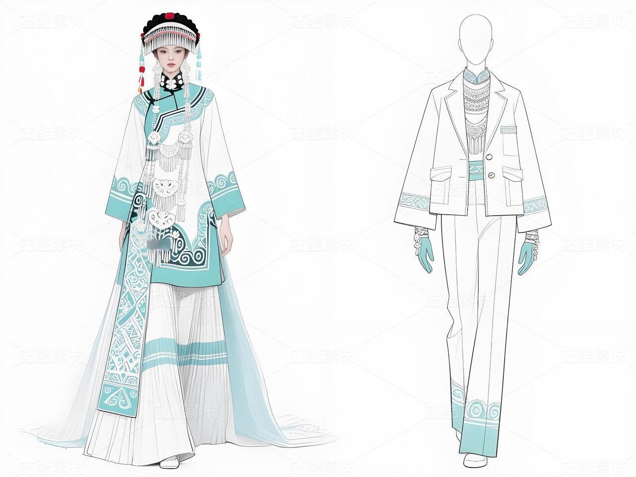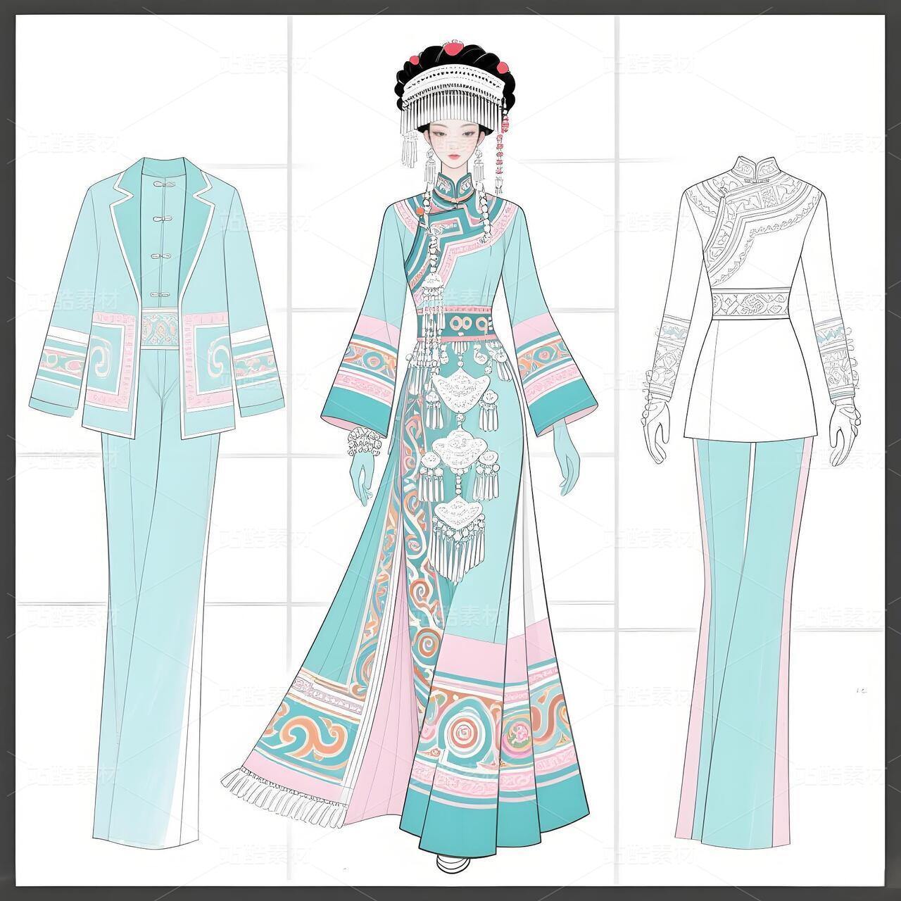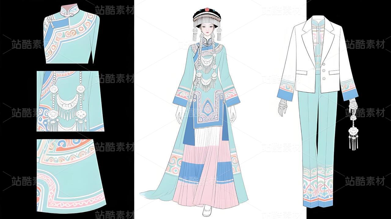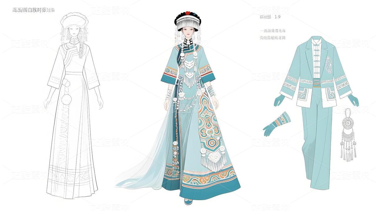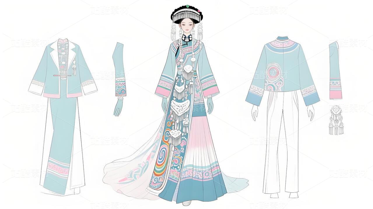 本系列以白族非遗服饰为灵感,将传统扎染、银饰与敦煌璎珞纹样相融合。礼服采用浅青与浅蓝为主色调,呼应白族“风花雪月”的清新意境,同时通过鲜明色彩对比与流畅剪裁,赋予高定时装现代张力。外套廓形借鉴白族坎肩的层叠结构,配以敦煌藻井纹样的刺绣与银璎珞挂饰,既保留民族符号的庄重感,又突破传统边界。裤子采用宽松丝绸材质,纹样提取自白族刺绣中的藤蔓与云纹,手套则以透薄面料叠加银线钩花,强调细节奢华。整体设计旨在探索非遗文化的当代美学表达,让民族服饰走向国际高定舞台。