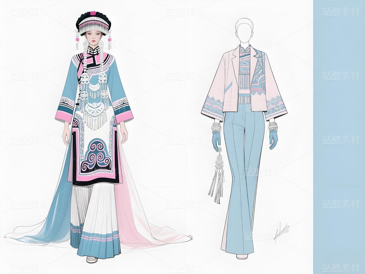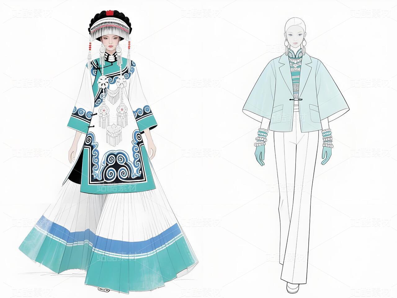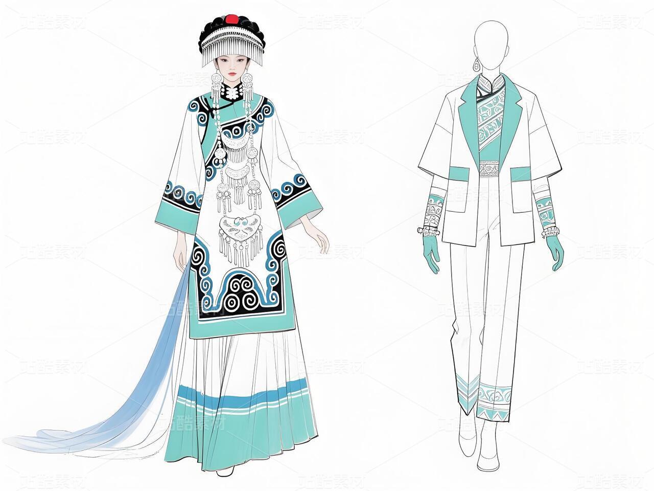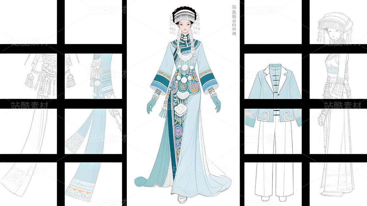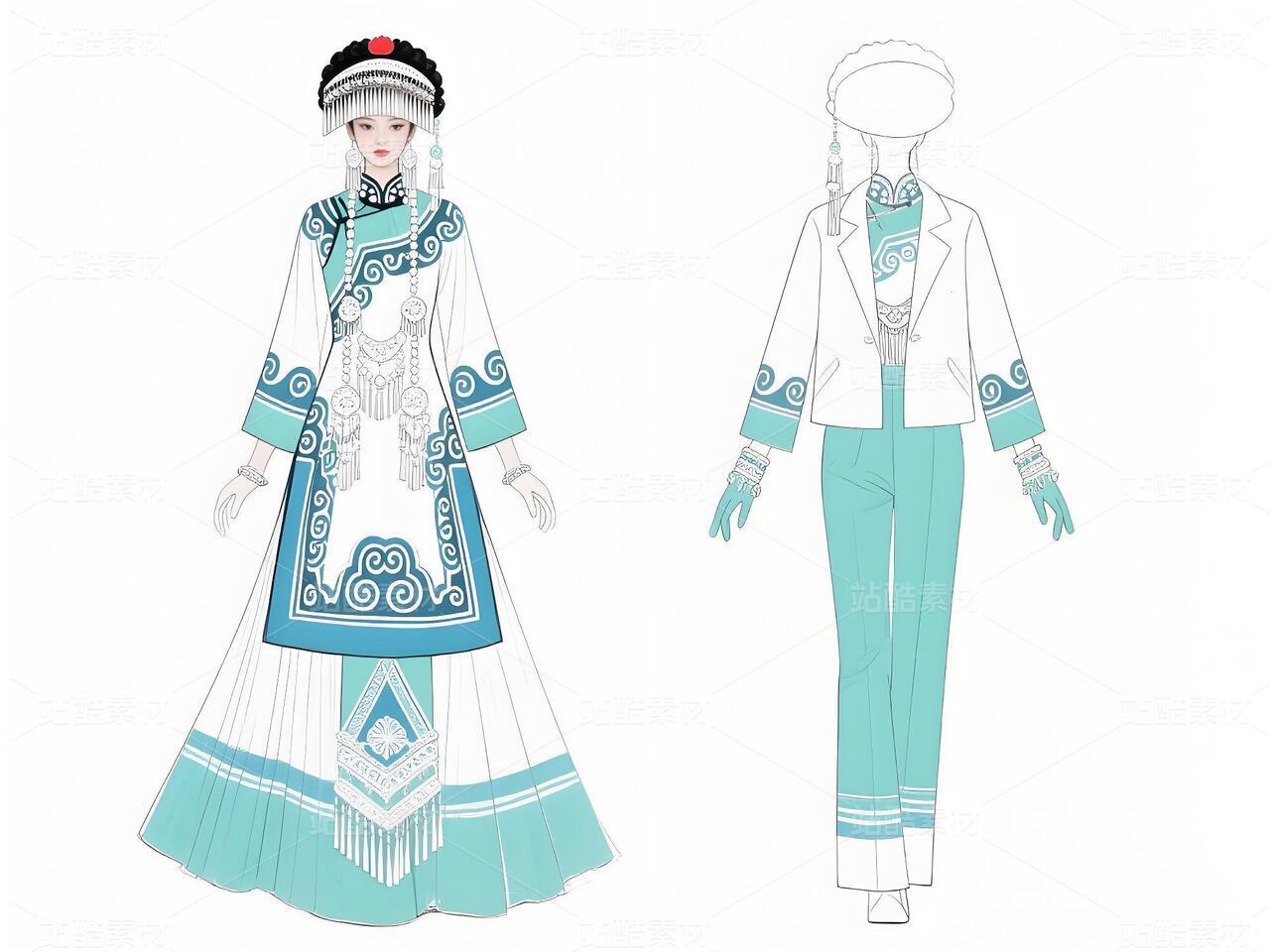 本系列以白族非遗服饰为灵感,将传统扎染、银饰与敦煌璎珞纹样相融合。礼服采用浅青与浅蓝为主色调,呼应白族“风花雪月”的清新意境,同时通过鲜明色彩对比与流畅剪裁,赋予高定时装现代张力。外套廓形借鉴白族坎肩的层叠结构,配以敦煌藻井纹样的刺绣与银璎珞挂饰,既保留民族符号的庄重感,又突破传统边界。裤子采用宽松丝绸材质,纹样提取自白族刺绣中的藤蔓与云纹,手套则以透薄面料叠加银线钩花,强调细节奢华。整体设计旨在探索非遗文化的当代美学表达,让民族服饰走向国际高定舞台。