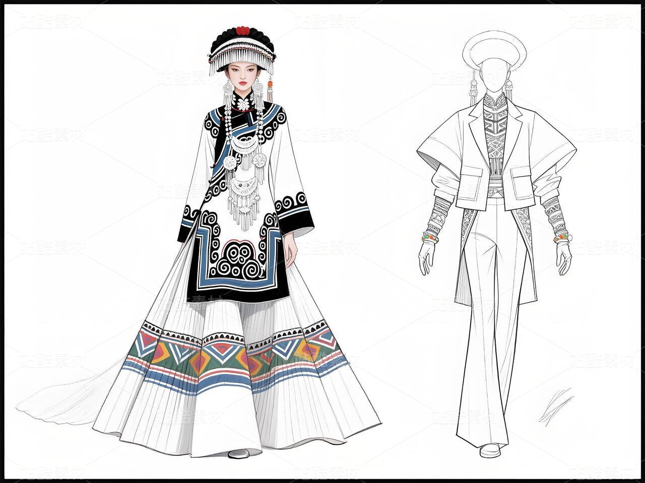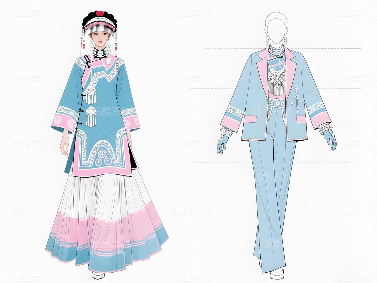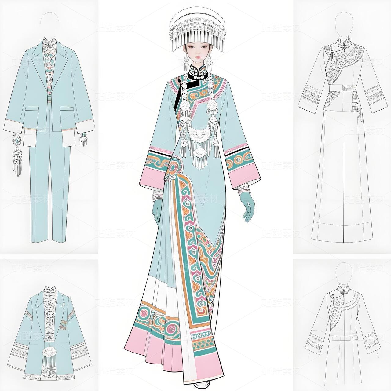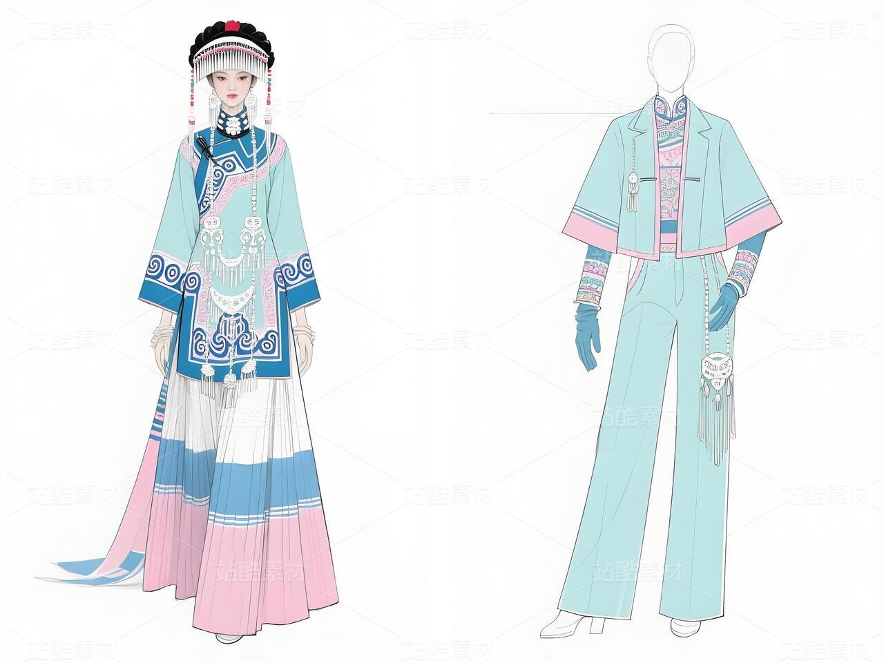 本系列以白族非遗服饰为灵感,将传统扎染、银饰与敦煌璎珞纹样相融合。礼服采用浅青与浅蓝为主色调,呼应白族“风花雪月”的清新意境,同时通过鲜明色彩对比与流畅剪裁,赋予高定时装现代张力。外套廓形借鉴白族坎肩的层叠结构,配以敦煌藻井纹样的刺绣与银璎珞挂饰,既保留民族符号的庄重感,又突破传统边界。裤子采用宽松丝绸材质,纹样提取自白族刺绣中的藤蔓与云纹,手套则以透薄面料叠加银线钩花,强调细节奢华。整体设计旨在探索非遗文化的当代美学表达,让民族服饰走向国际高定舞台。