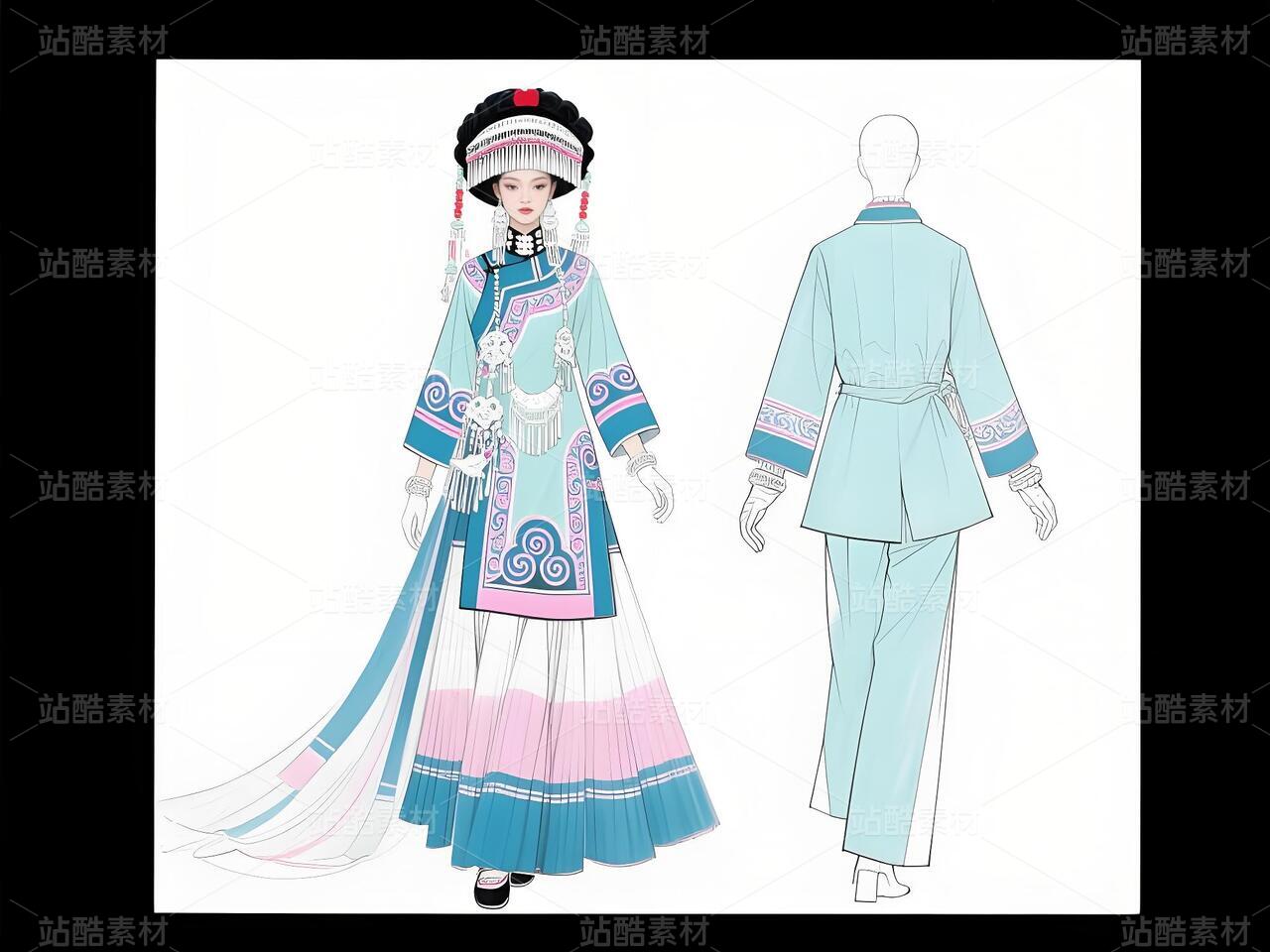 本系列以白族非遗服饰为灵感,将传统扎染、银饰与敦煌璎珞纹样相融合。礼服采用浅青与浅蓝为主色调,呼应白族“风花雪月”的清新意境,同时通过鲜明色彩对比与流畅剪裁,赋予高定时装现代张力。外套廓形借鉴白族坎肩的层叠结构,配以敦煌藻井纹样的刺绣与银璎珞挂饰,既保留民族符号的庄重感,又突破传统边界。裤子采用宽松丝绸材质,纹样提取自白族刺绣中的藤蔓与云纹,手套则以透薄面料叠加银线钩花,强调细节奢华。整体设计旨在探索非遗文化的当代美学表达,让民族服饰走向国际高定舞台。