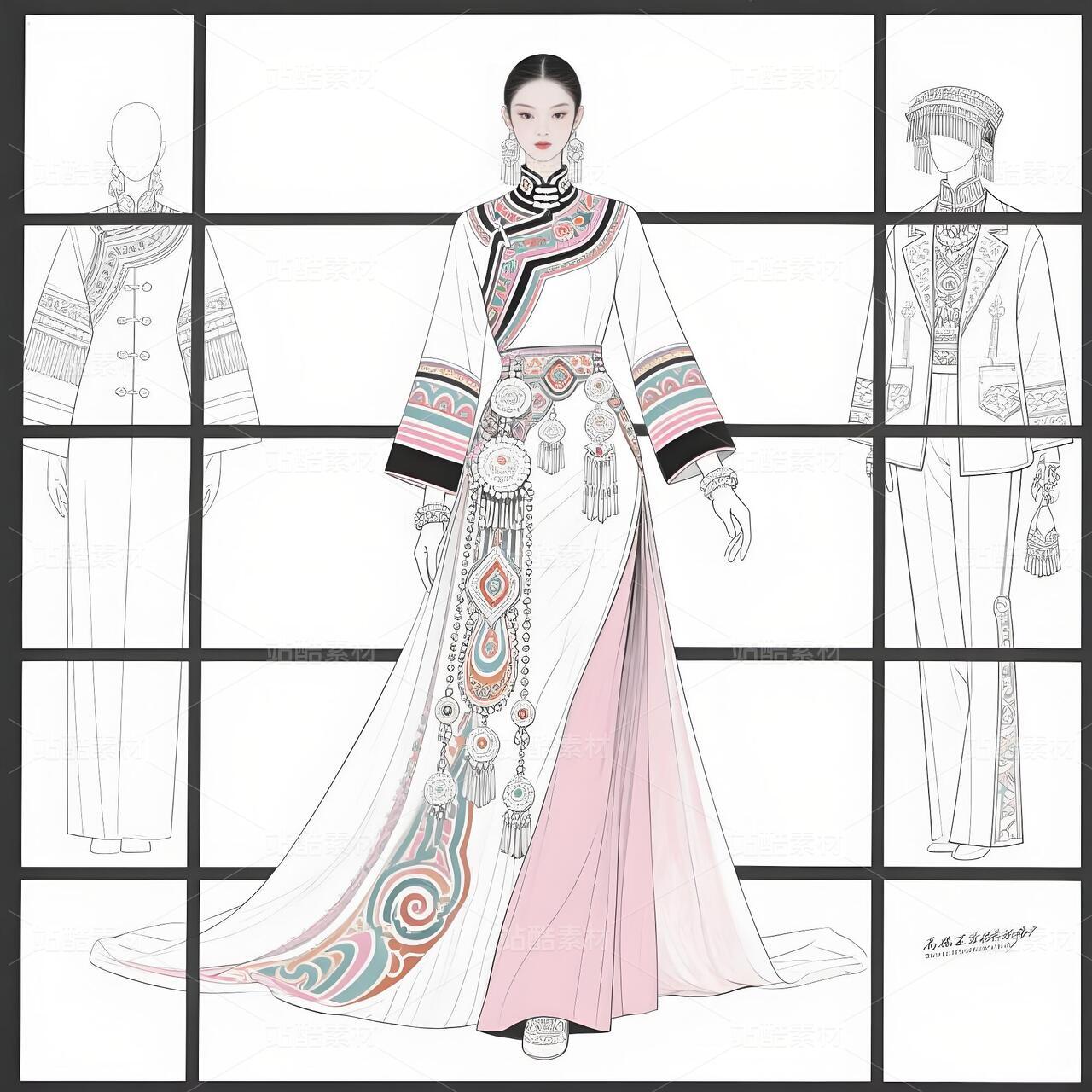 本系列以白族非遗服饰为灵感,将传统扎染、银饰与敦煌璎珞纹样相融合。礼服采用浅青与浅蓝为主色调,呼应白族“风花雪月”的清新意境,同时通过鲜明色彩对比与流畅剪裁,赋予高定时装现代张力。外套廓形借鉴白族坎肩的层叠结构,配以敦煌藻井纹样的刺绣与银璎珞挂饰,既保留民族符号的庄重感,又突破传统边界。裤子采用宽松丝绸材质,纹样提取自白族刺绣中的藤蔓与云纹,手套则以透薄面料叠加银线钩花,强调细节奢华。整体设计旨在探索非遗文化的当代美学表达,让民族服饰走向国际高定舞台。