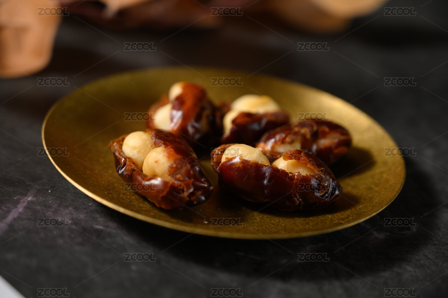 桌面上的盘子里的美味可口的椰枣夏威夷果仁