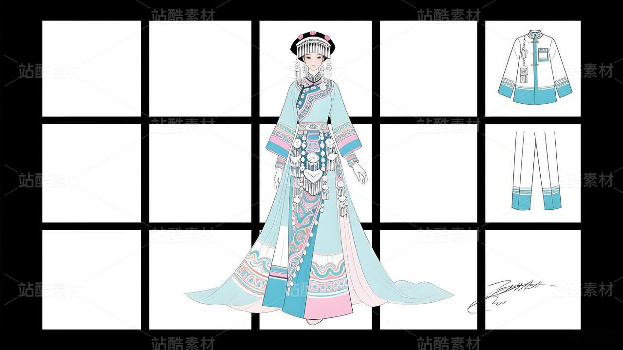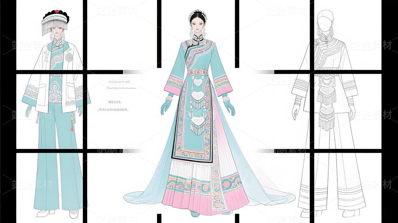 本系列高定礼服“风月璎珞”深入云南大理,汲取白族“风花雪月”的浪漫意象与非遗技艺精髓。设计以浅青与浅蓝为主色调,象征苍山洱海的清澈与静谧。款式上,将白族女性服饰的端庄廓形与现代剪裁相结合,并大胆融入敦煌璎珞纹样的华丽与繁复。礼服领口、袖口及背部饰以精美的银链璎珞与藻井图案刺绣,与白族扎染的天然冰裂纹理形成鲜明而和谐的视觉对话。手套、头饰等配饰均延续此设计语言,旨在打造一件既是民族文化遗产颂歌,亦是国际时尚前沿之作的艺术礼服。
