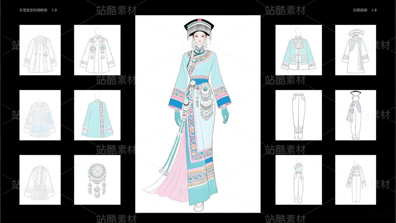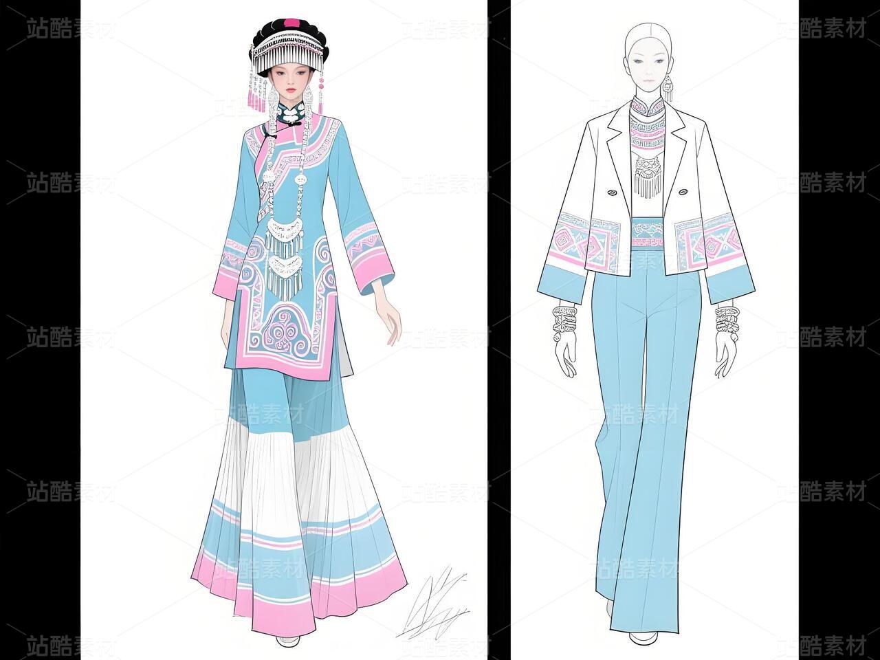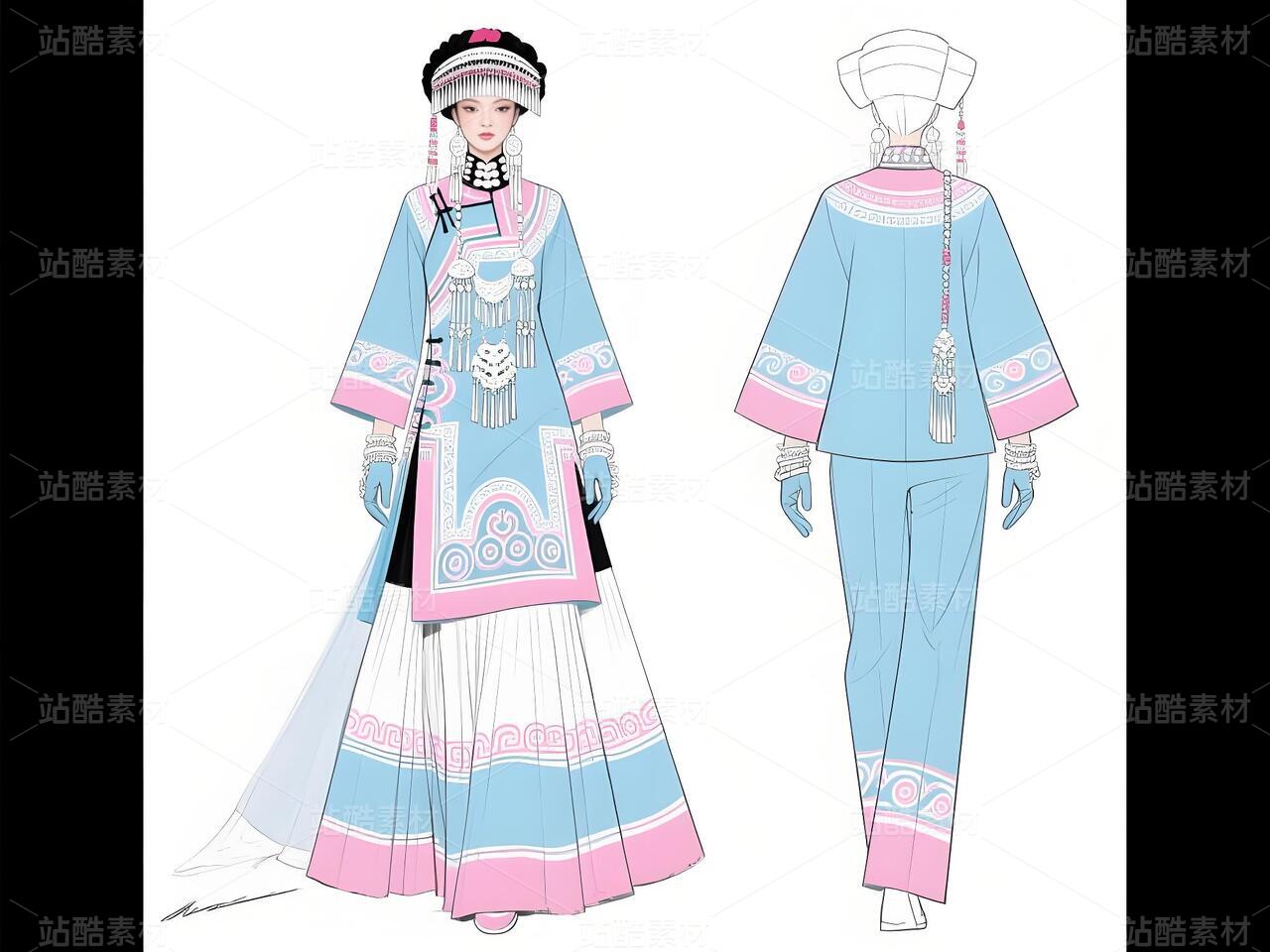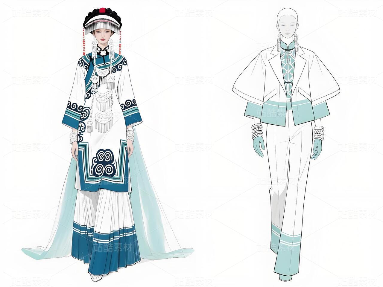 本系列高定礼服“风月璎珞”深入云南大理,汲取白族“风花雪月”的浪漫意象与非遗技艺精髓。设计以浅青与浅蓝为主色调,象征苍山洱海的清澈与静谧。款式上,将白族女性服饰的端庄廓形与现代剪裁相结合,并大胆融入敦煌璎珞纹样的华丽与繁复。礼服领口、袖口及背部饰以精美的银链璎珞与藻井图案刺绣,与白族扎染的天然冰裂纹理形成鲜明而和谐的视觉对话。手套、头饰等配饰均延续此设计语言,旨在打造一件既是民族文化遗产颂歌,亦是国际时尚前沿之作的艺术礼服。