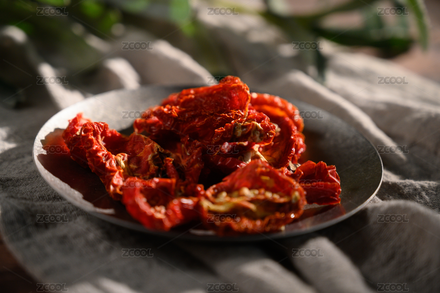 桌面上的盘子里的美味可口的西红柿干