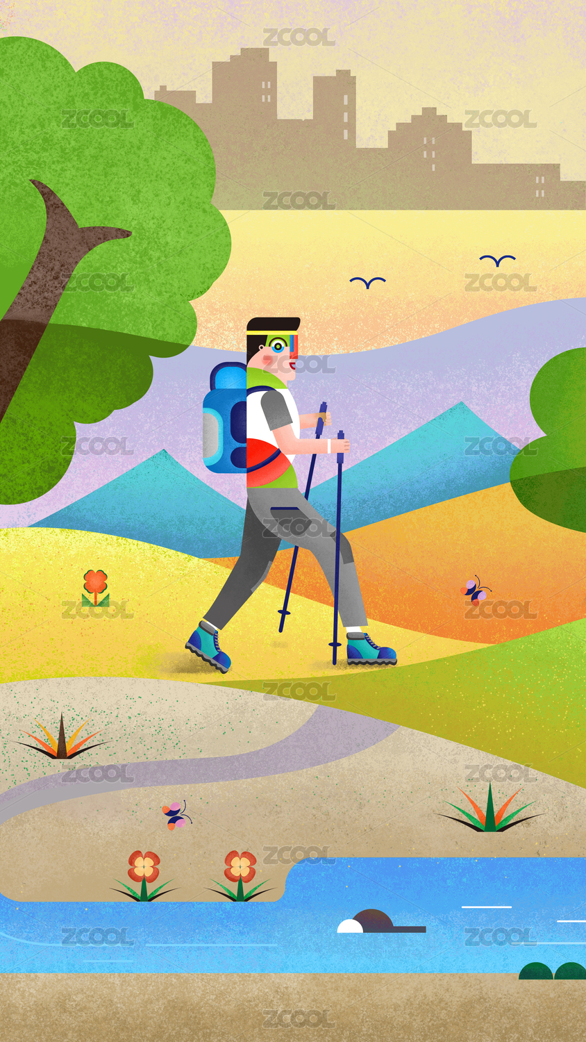 卡通人物夏季踏青旅游登山风景出行矢量插画