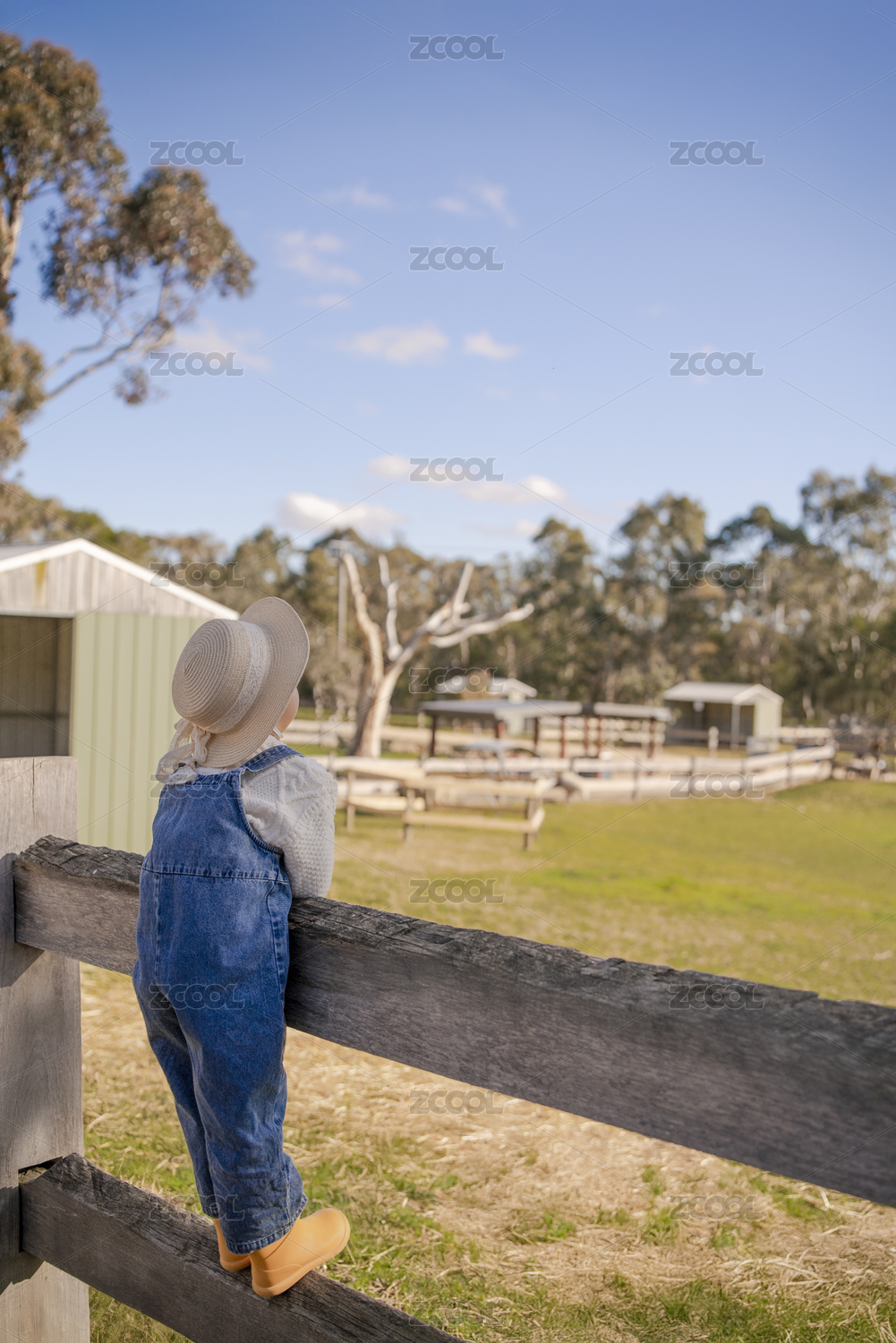 小女孩攀爬站立在木围栏上兴奋地观看农庄牛