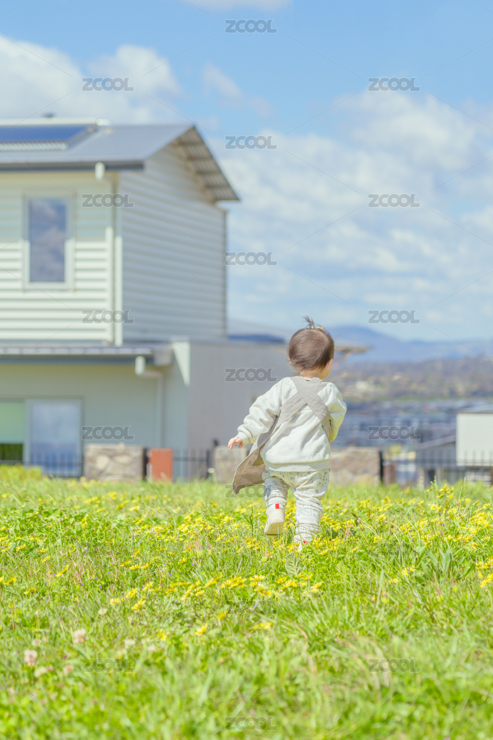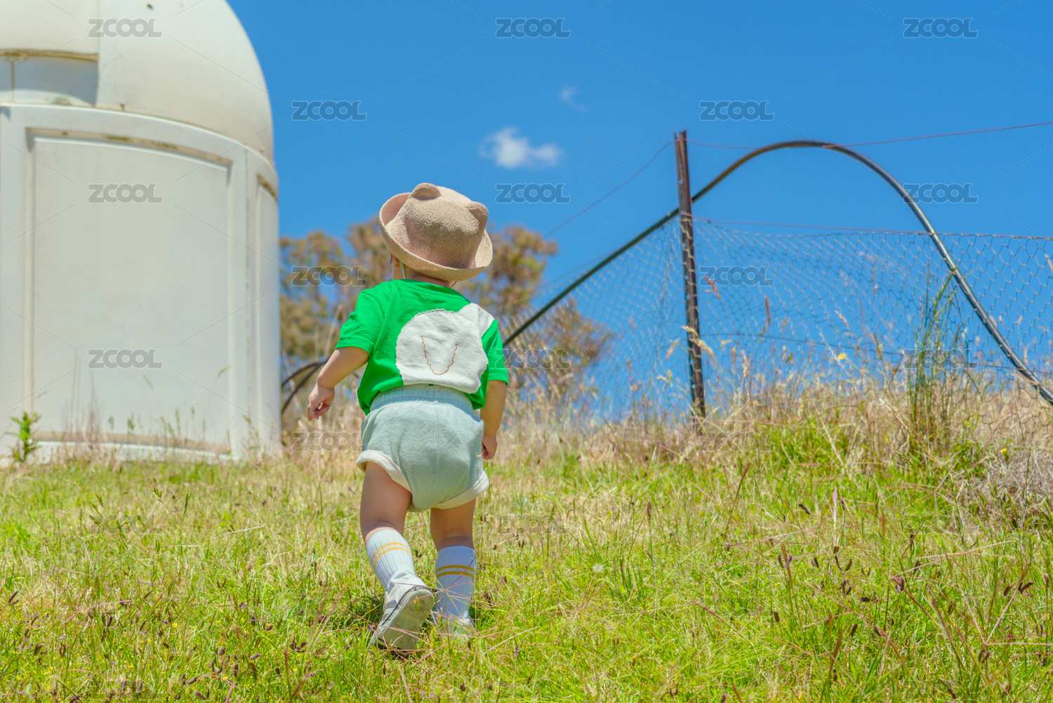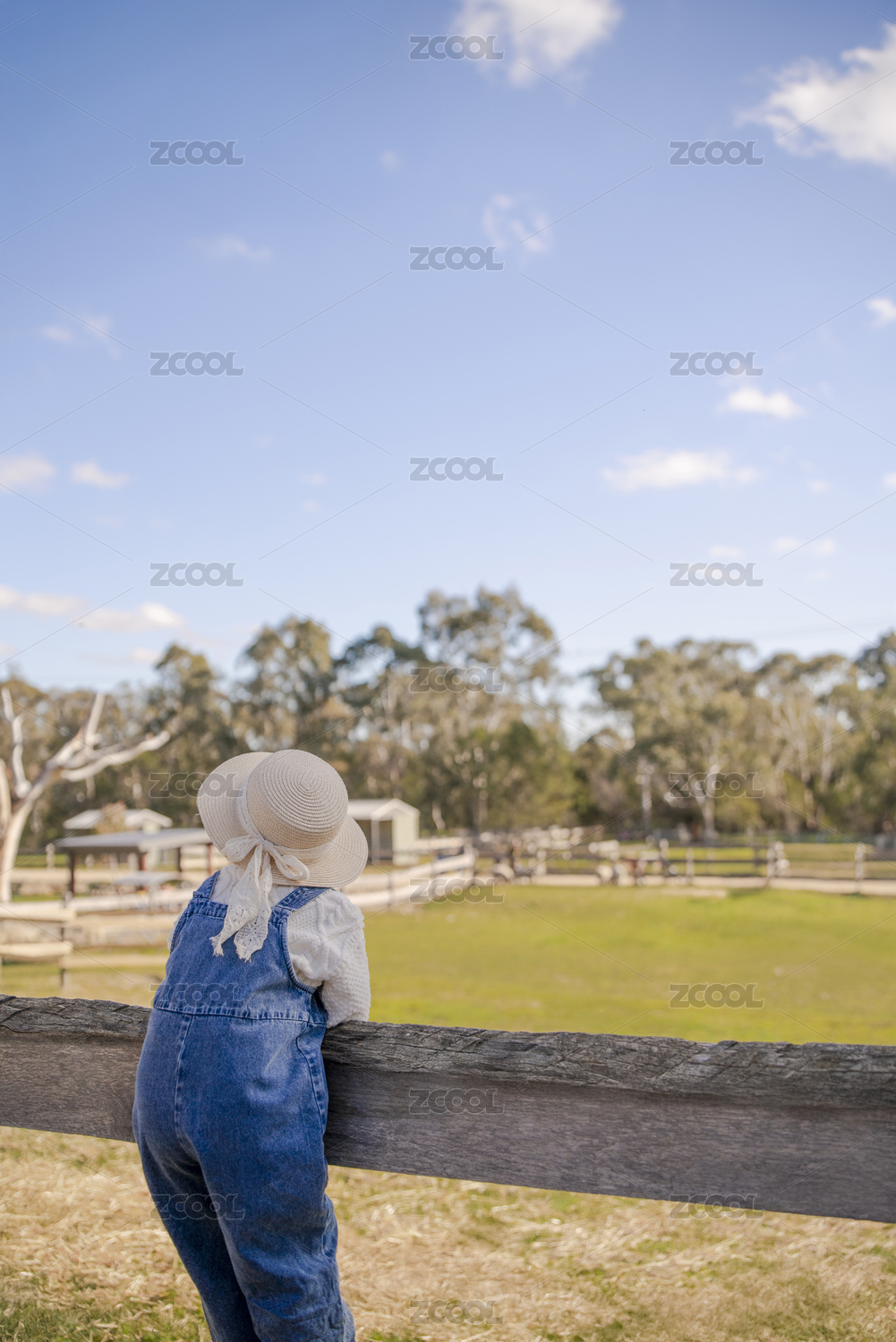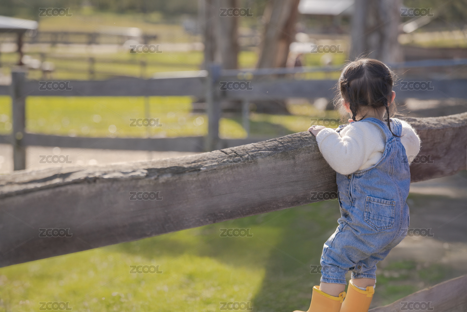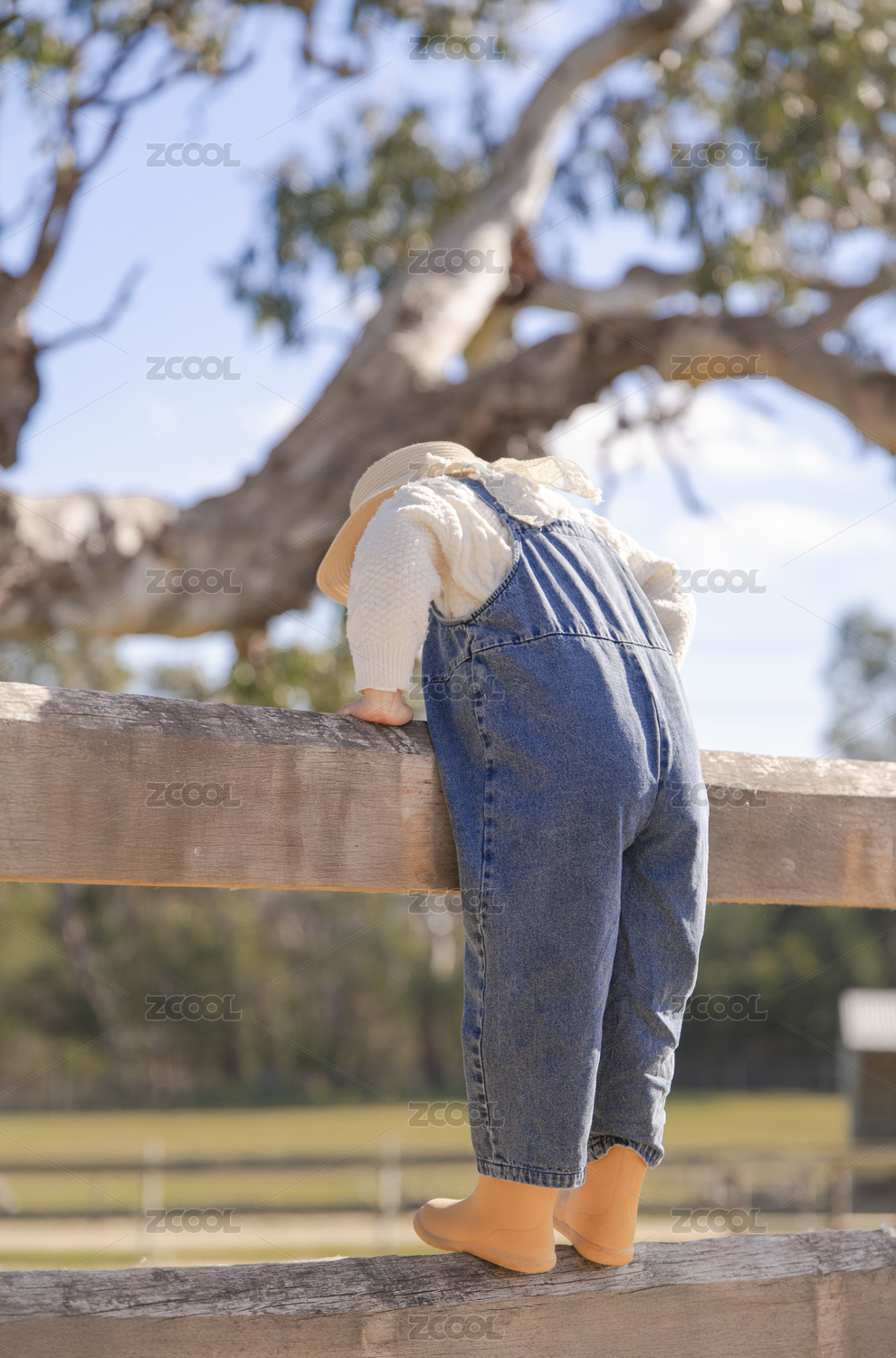 攀爬站立在木围栏上兴趣地观看牛羊的小孩