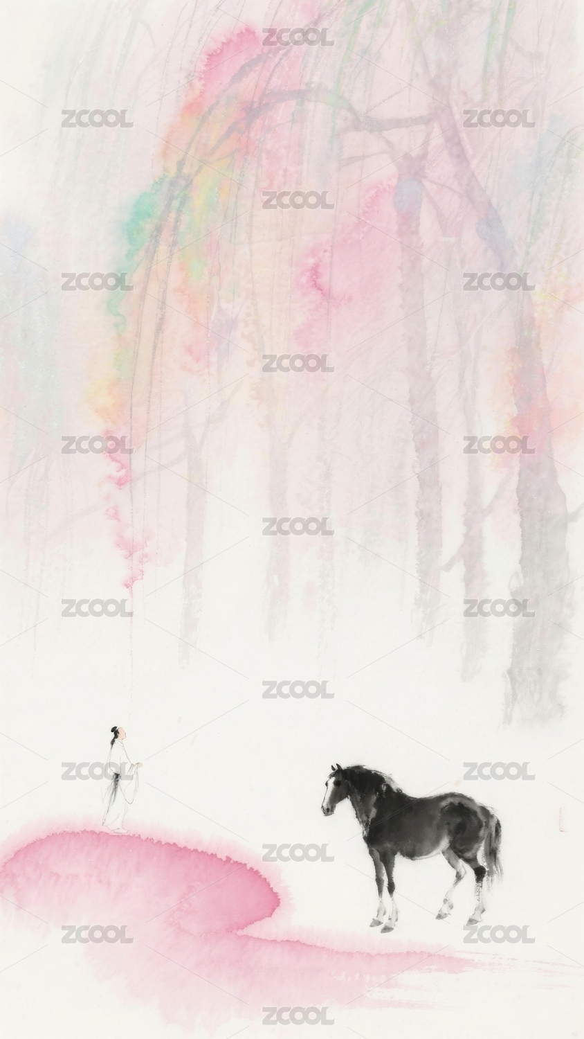 水墨画宁静森林中骑马穿行