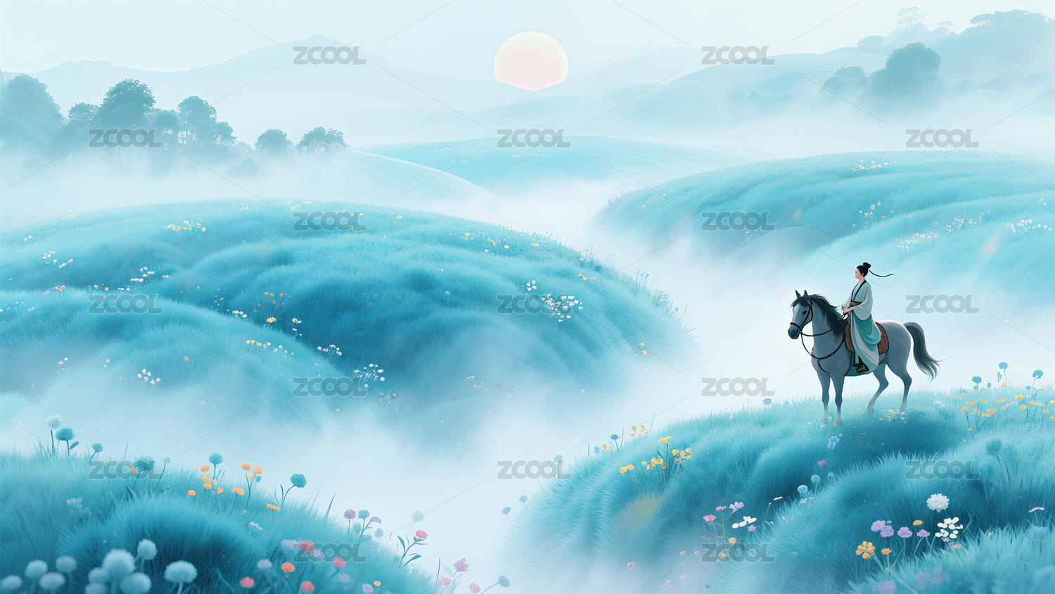 新中式羊毛毡风格点彩水墨梦幻雾气插画