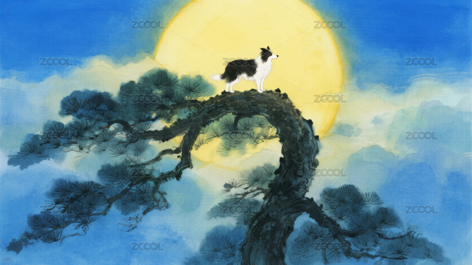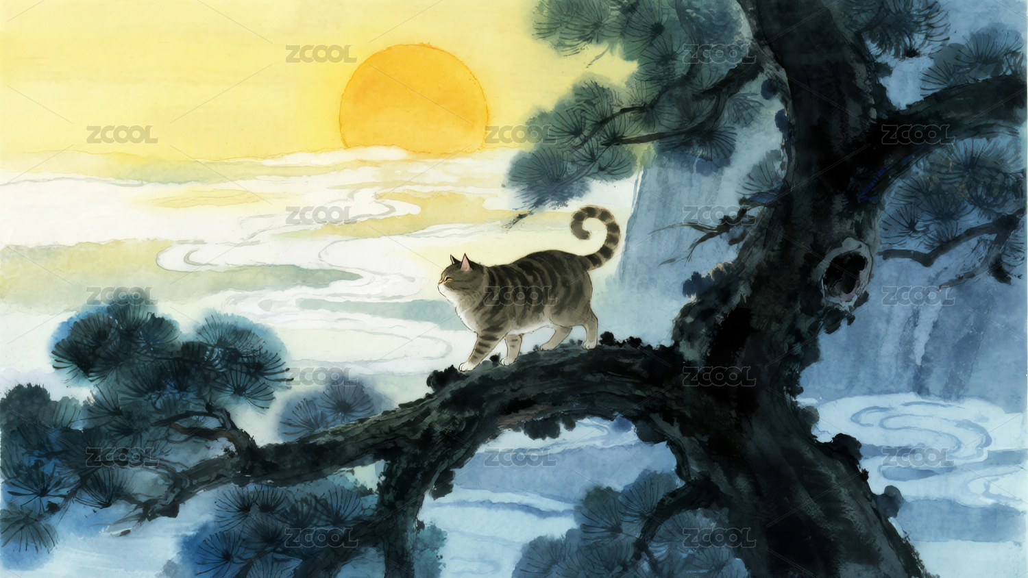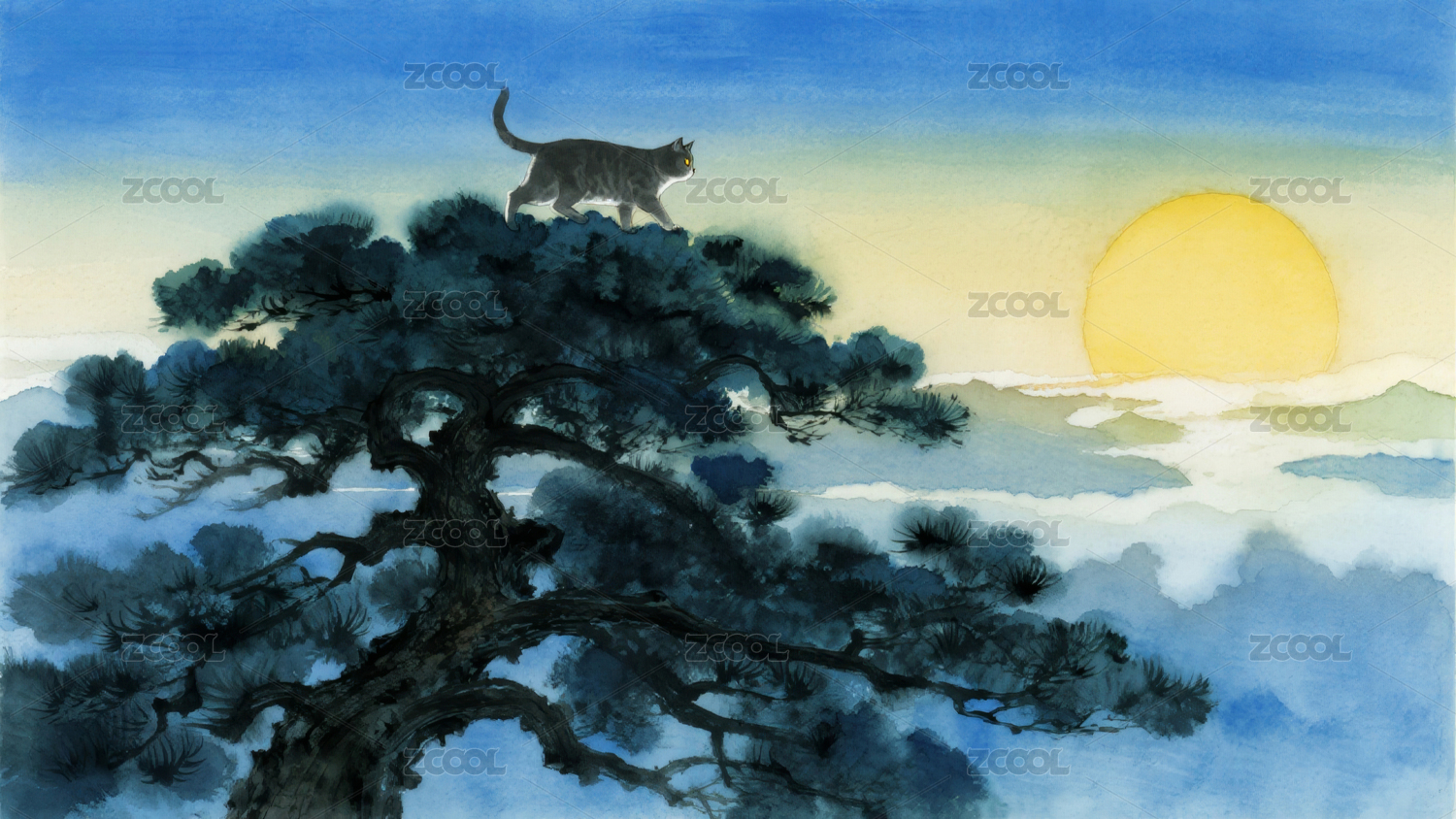 松树上的猫与满月