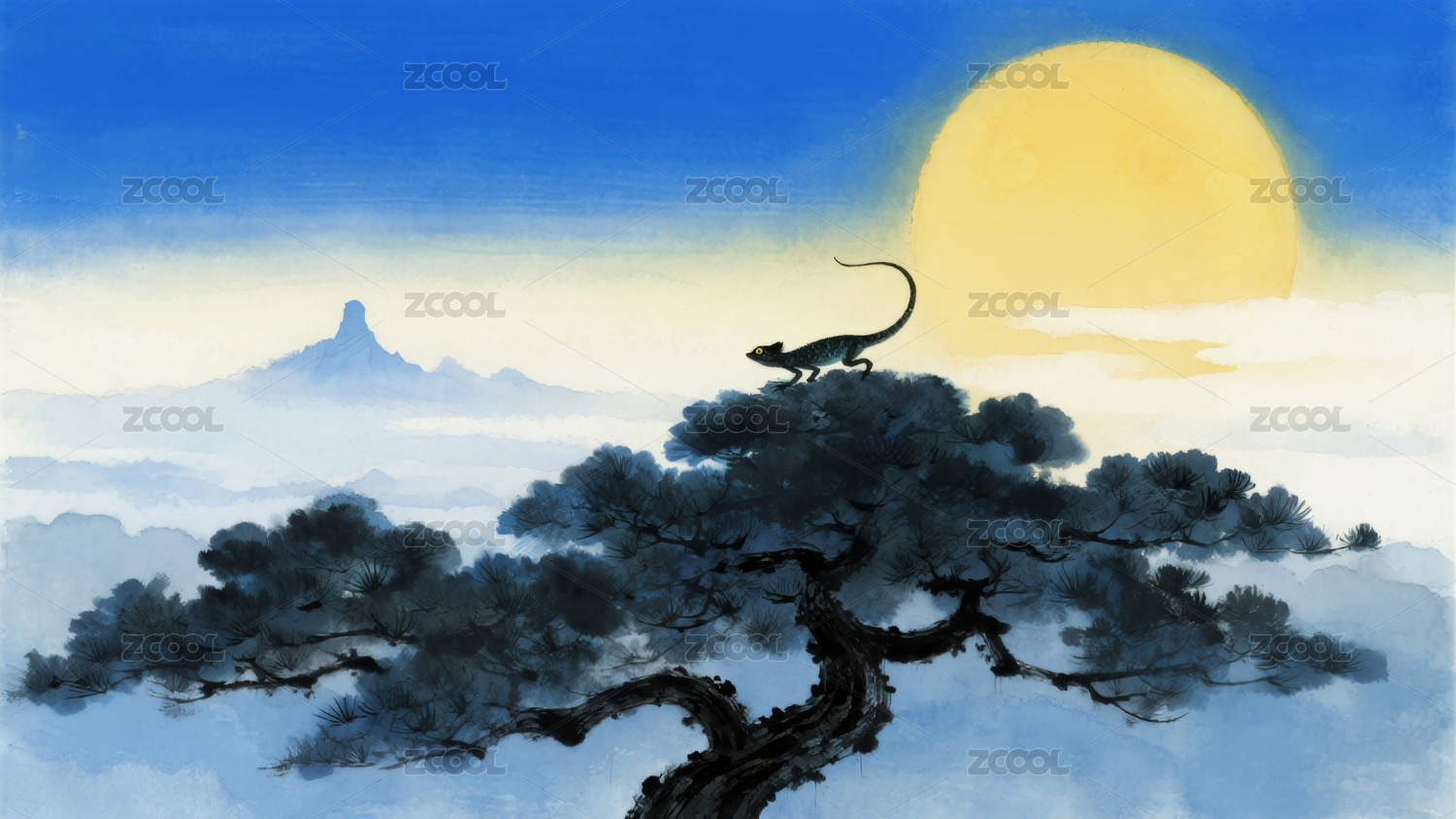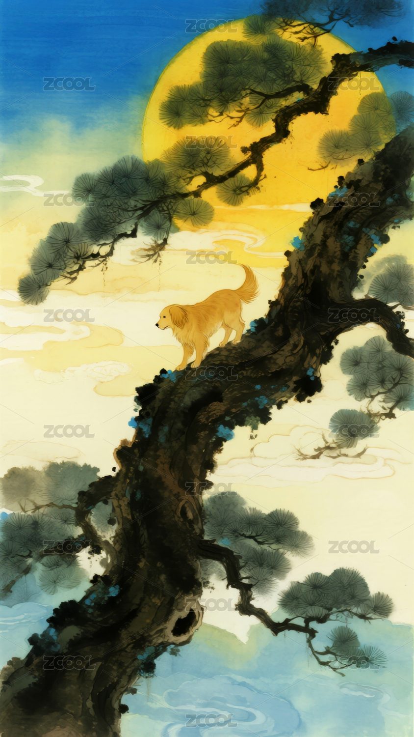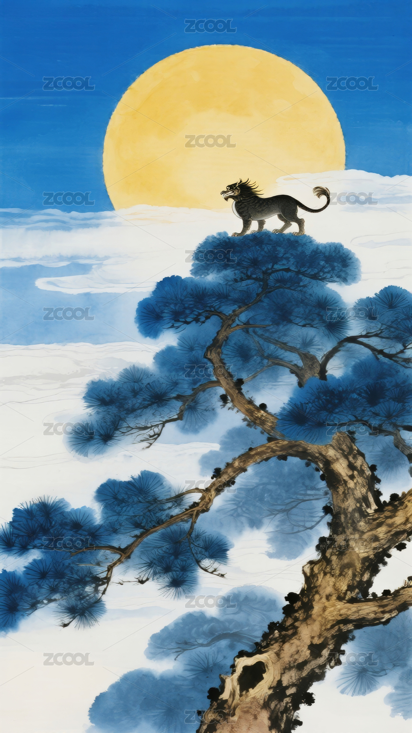 松树上的猫与满月