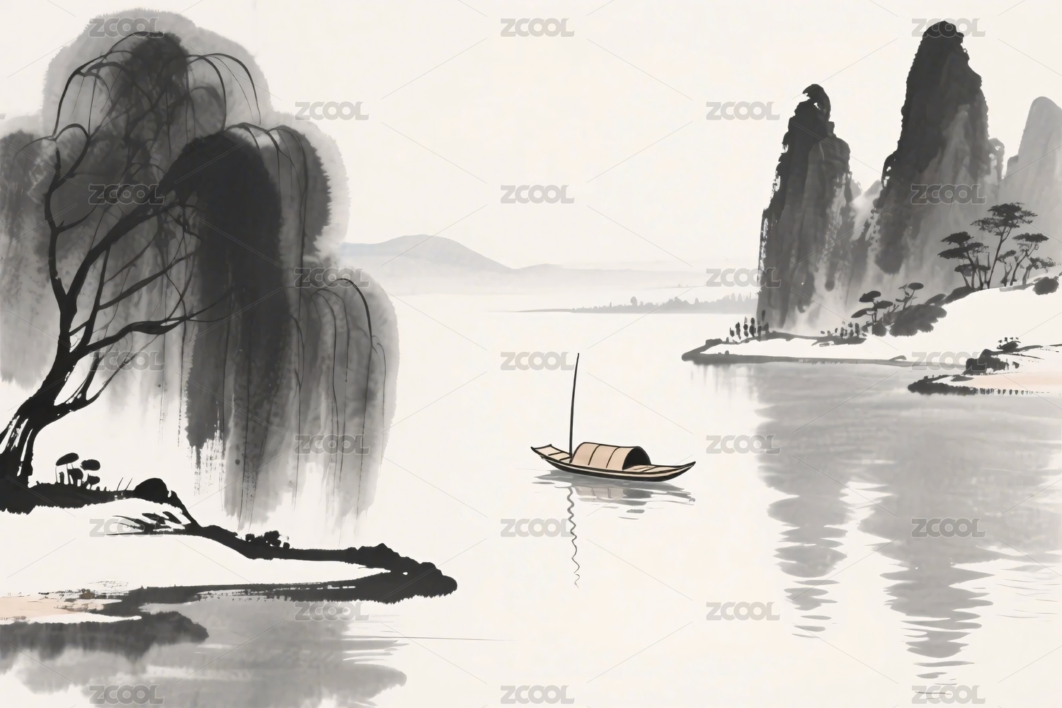 水墨风格山水泛舟图景