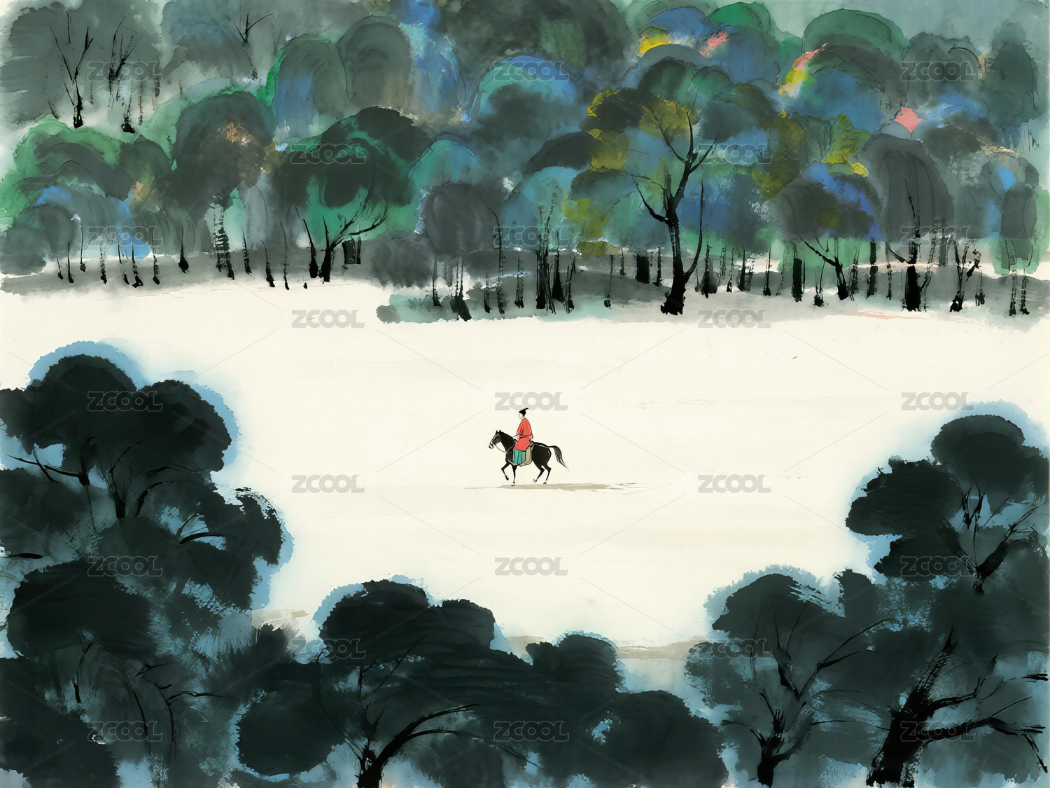 水墨画宁静森林中骑马穿行