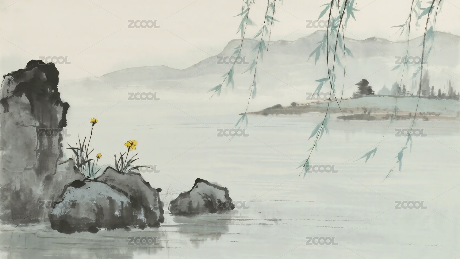 水墨写意春日湖畔