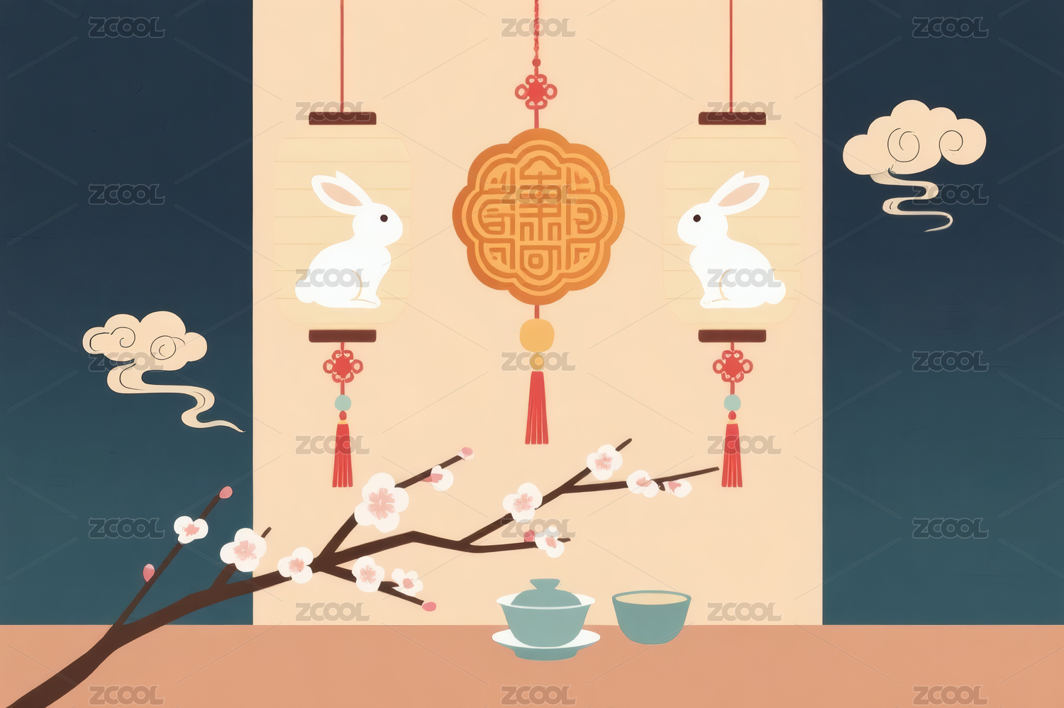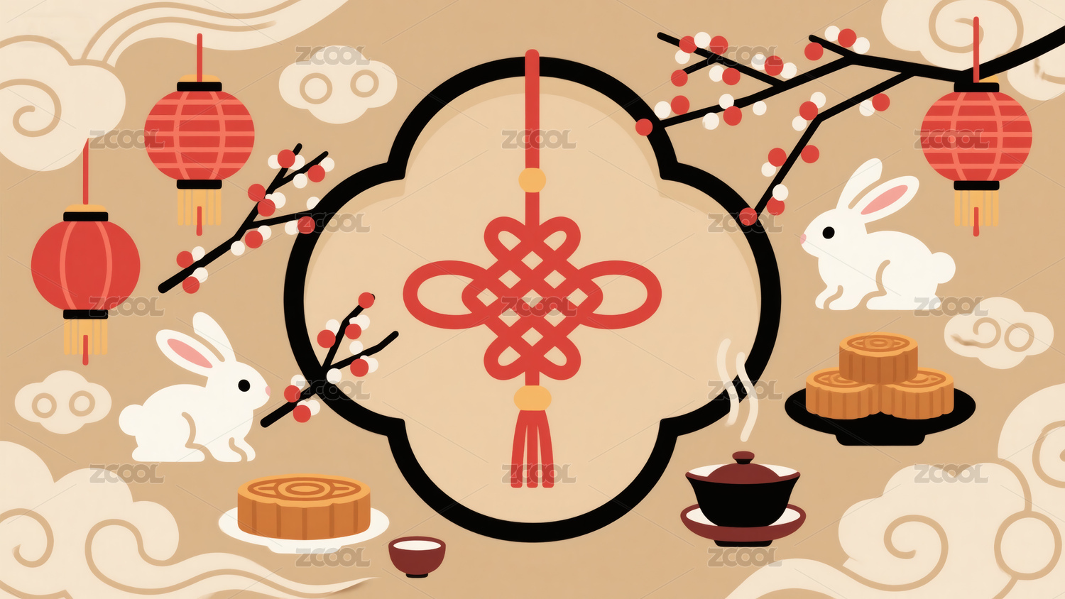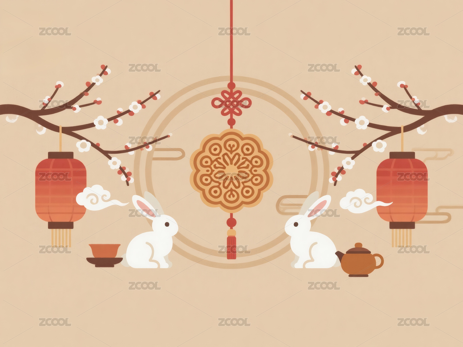 中国剪纸风兔子和灯笼