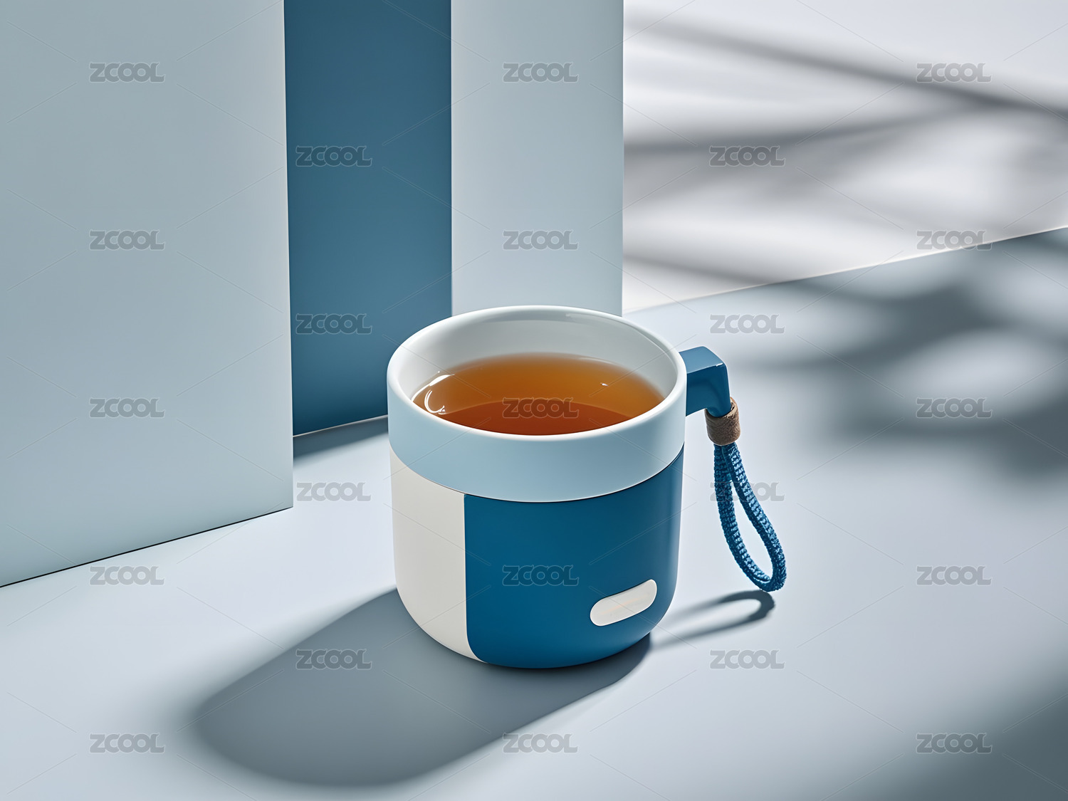 浅灰色背景前盛茶水的带挂绳水杯