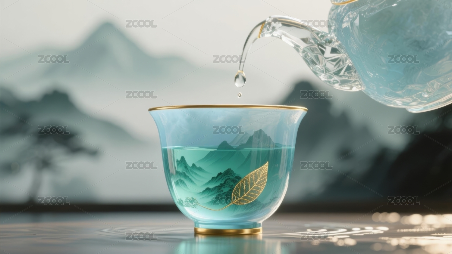 微观场景创意青花瓷山水画茶碗写意艺术插画