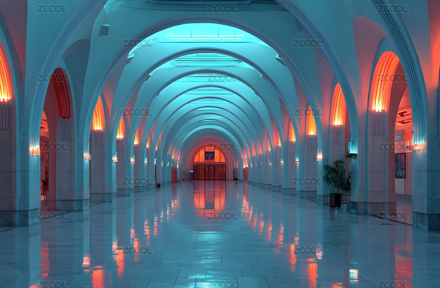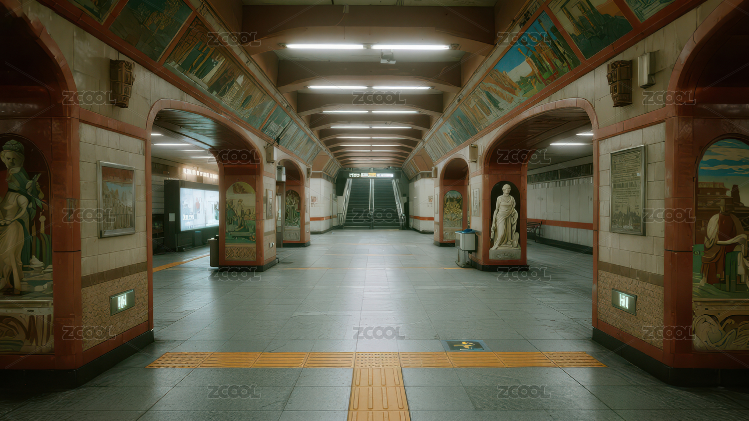 城市交通,公共设施,地下车站,拱廊设计,大理石柱,瓷砖地面,灯光照明,对称布局,装饰艺术,室内空间