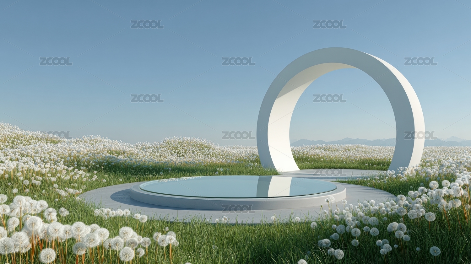 梦幻蒲公英花海中的现代艺术拱门