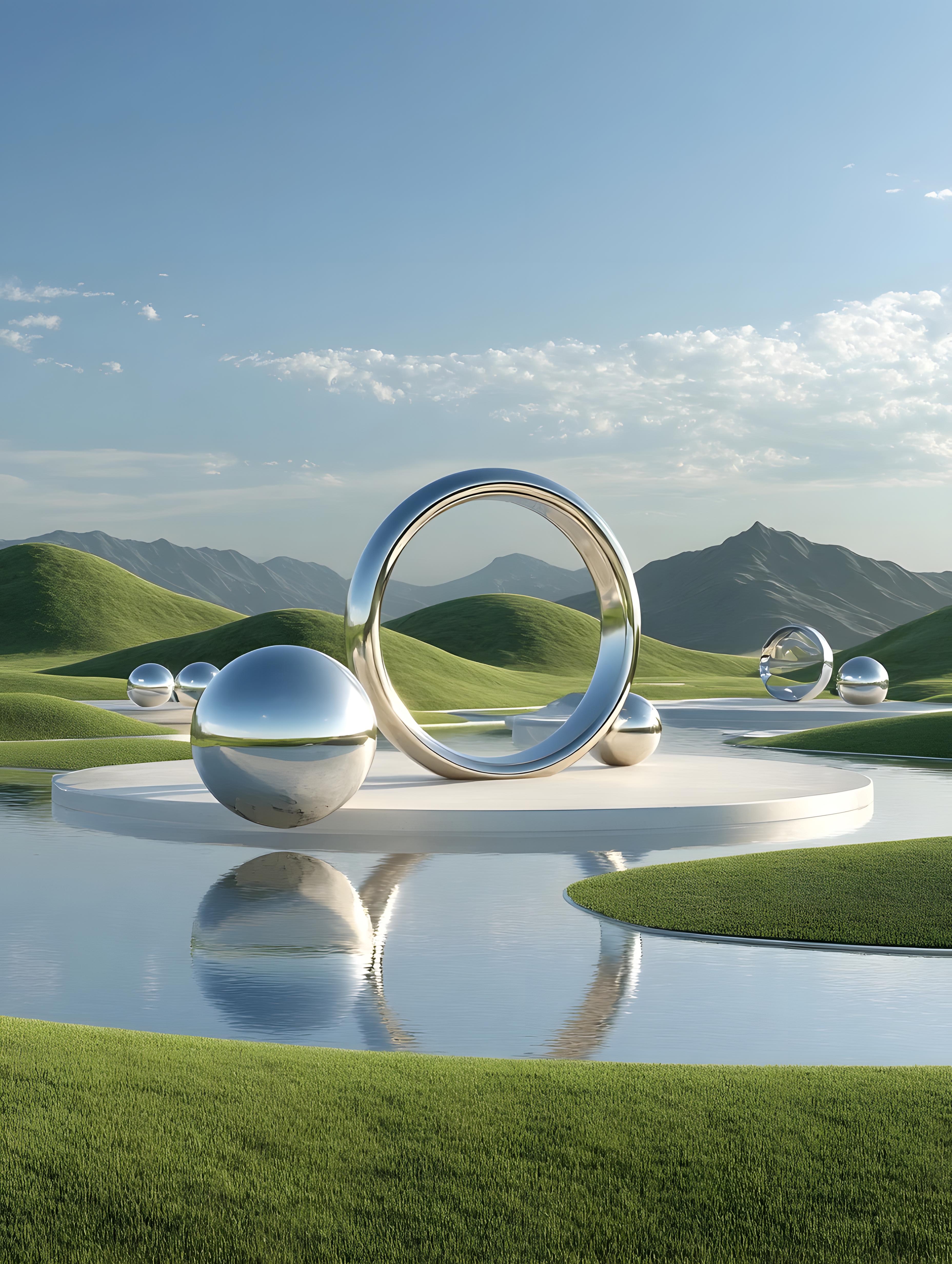 绿色山丘与镜面雕塑