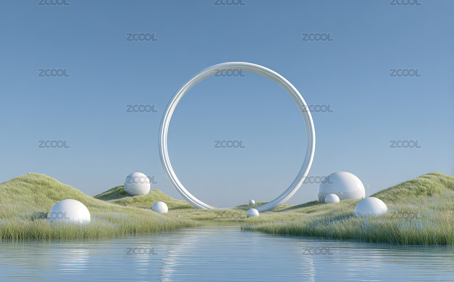 草地上的金属球与山水