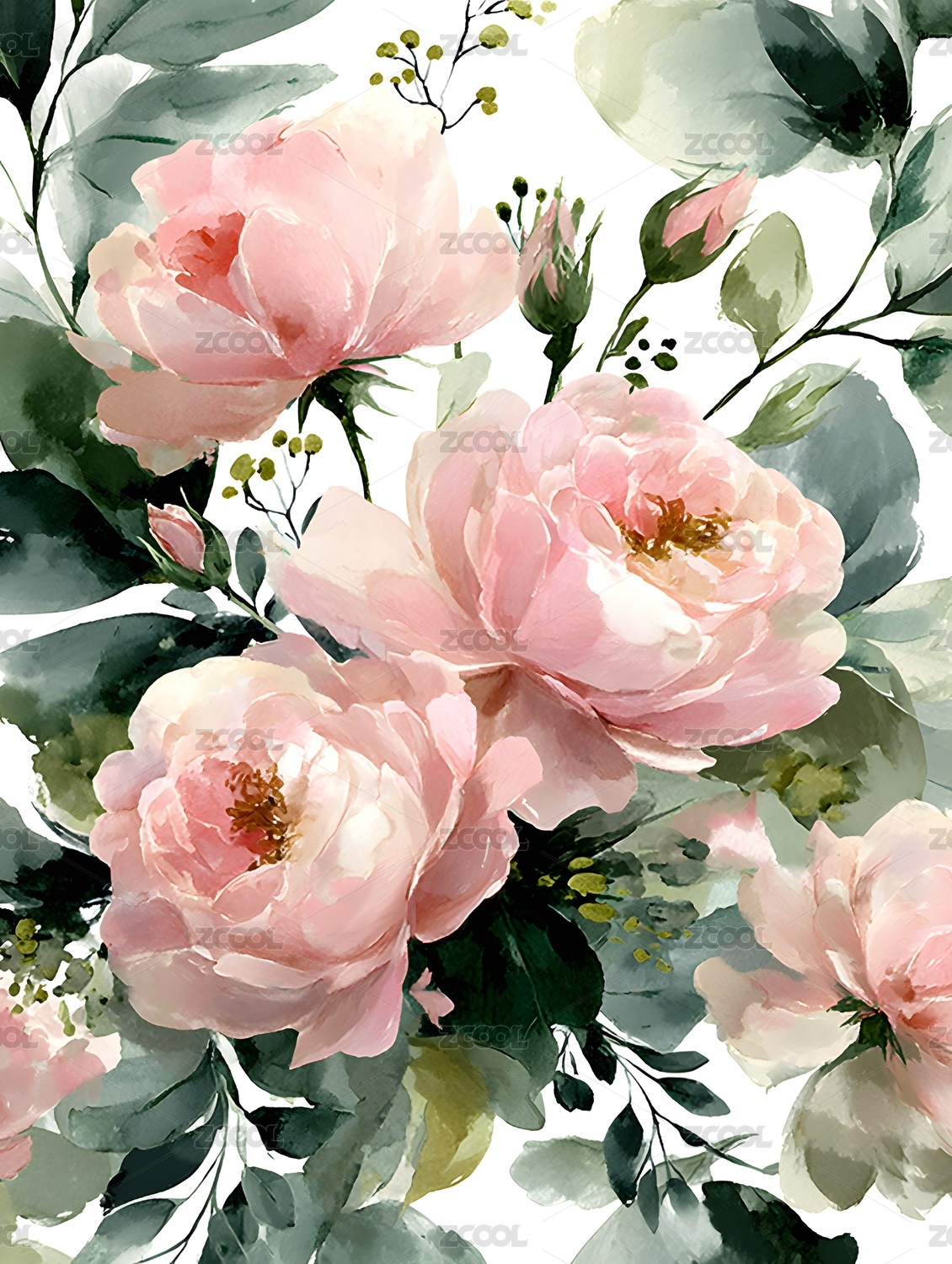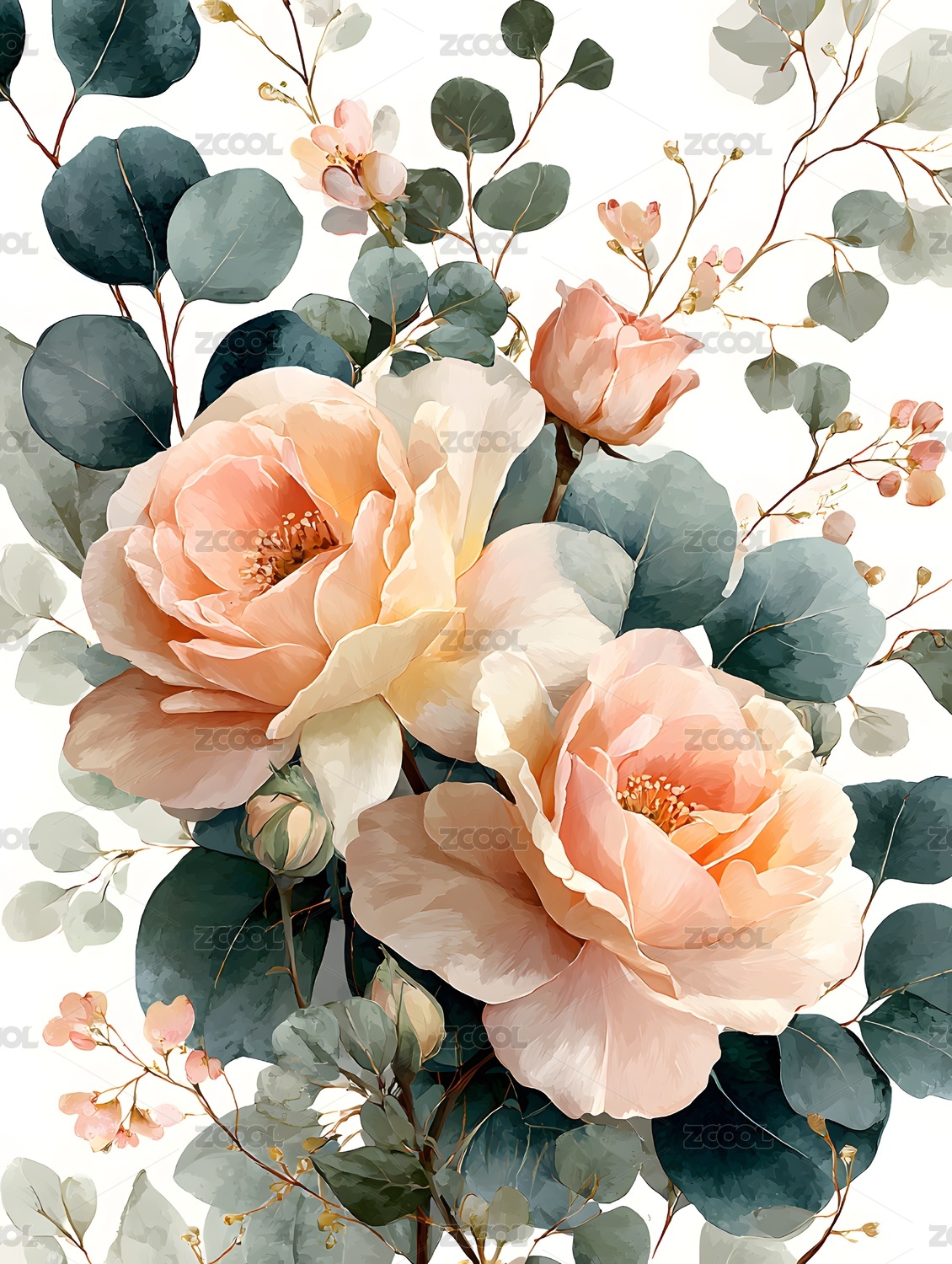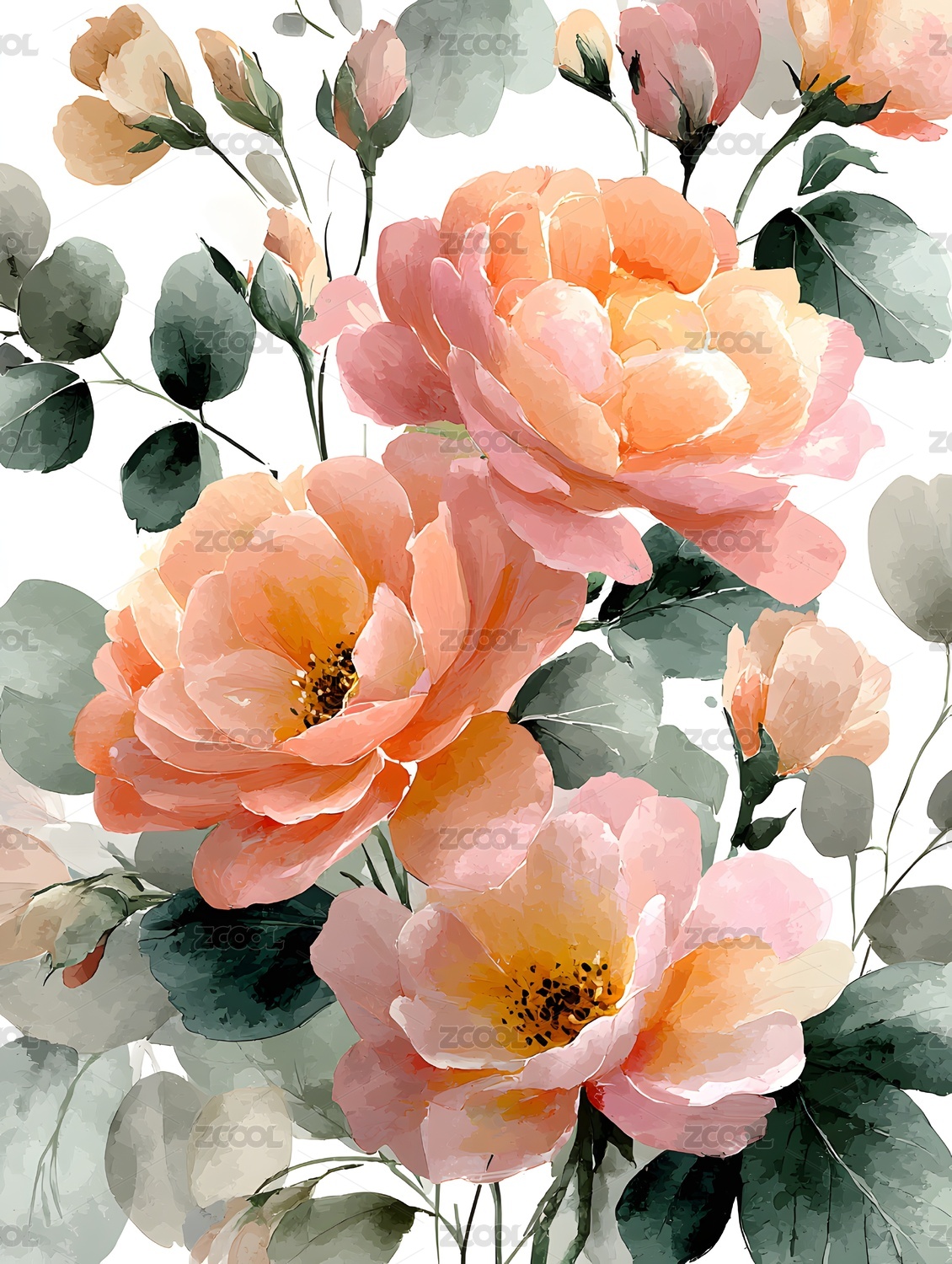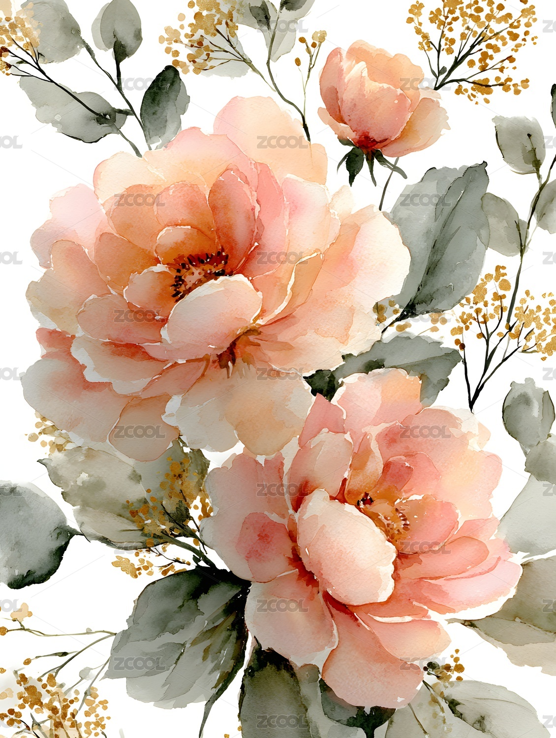 花朵,叶子,花心,花卉,枝条,水彩,花瓣,花束,绿叶,绘画