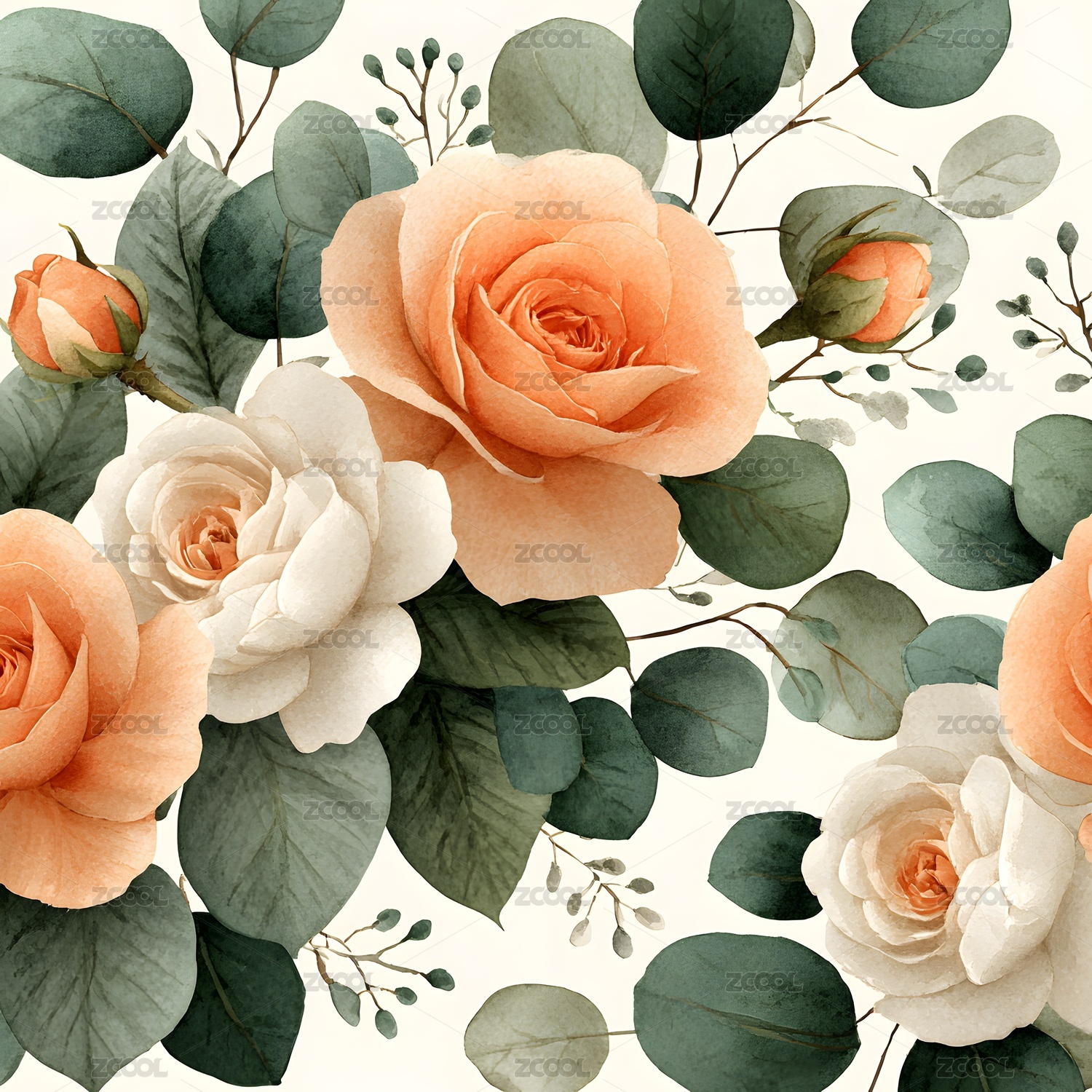 水彩玫瑰与绿叶花卉插画