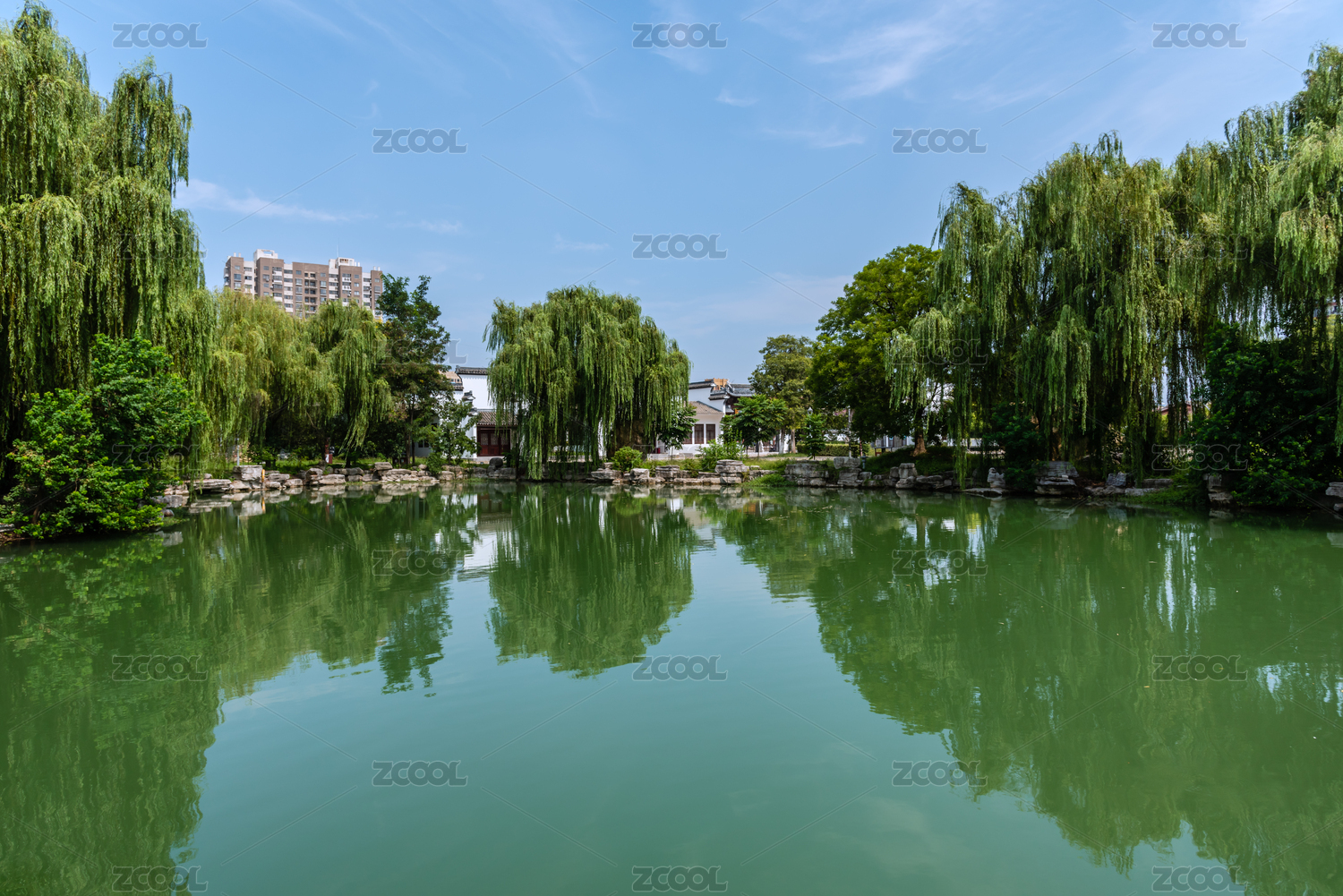 绿树池塘