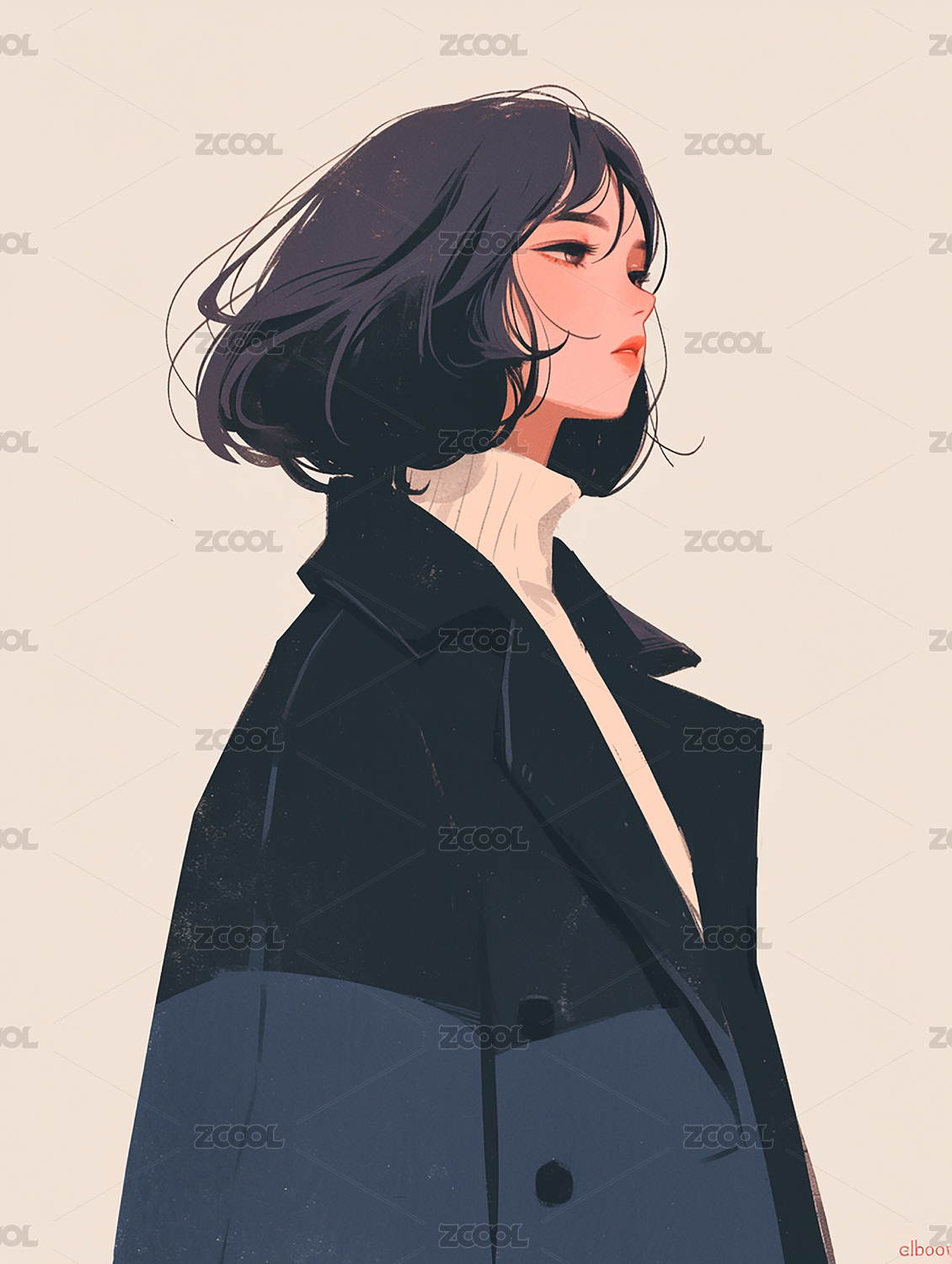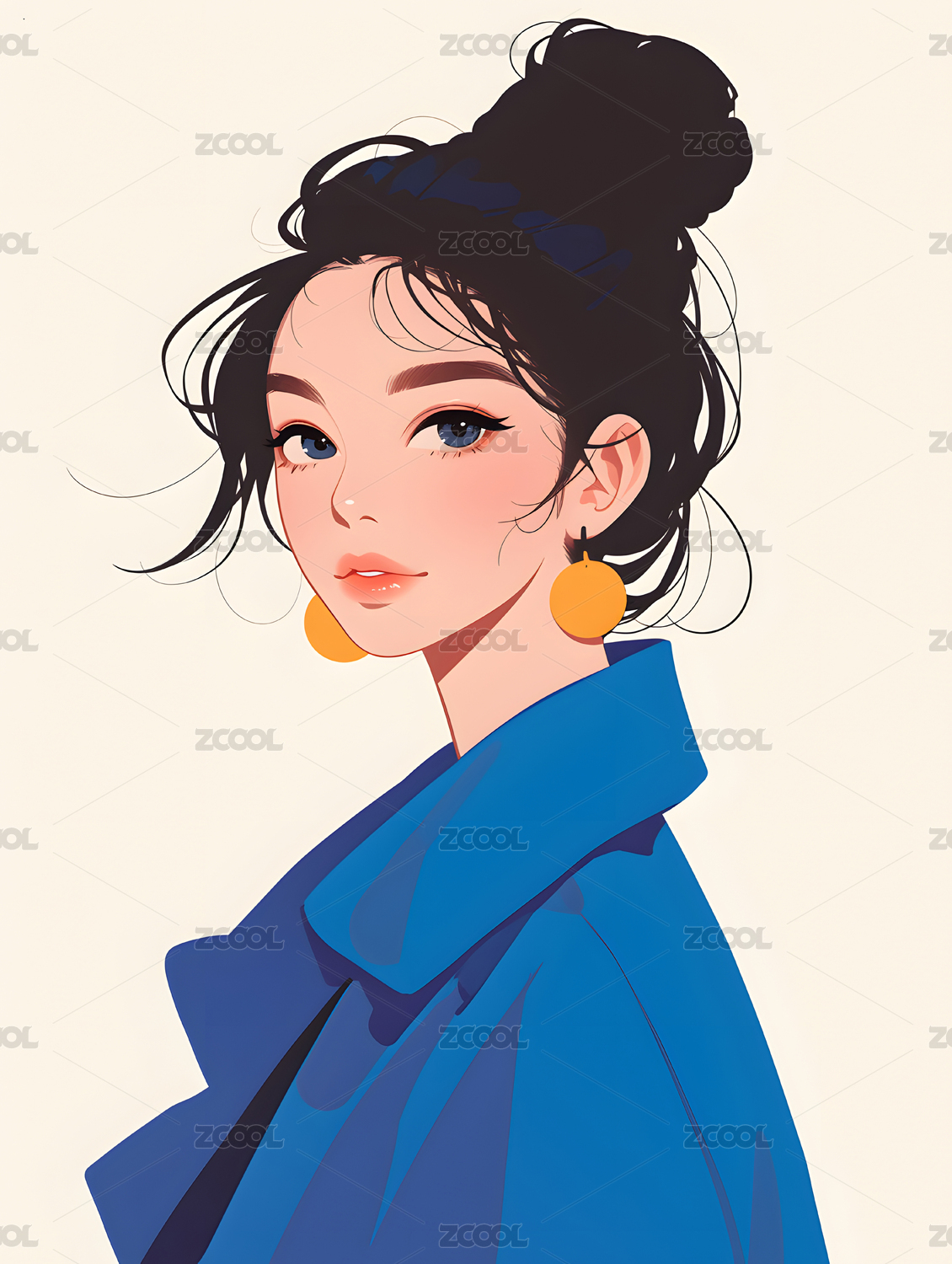穿着蓝色长风衣的女性插画