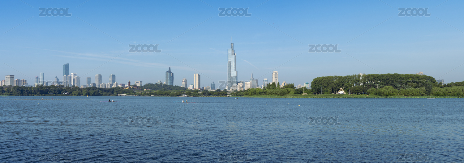 航拍中国江苏南京玄武湖城市建筑天际线全景大画幅