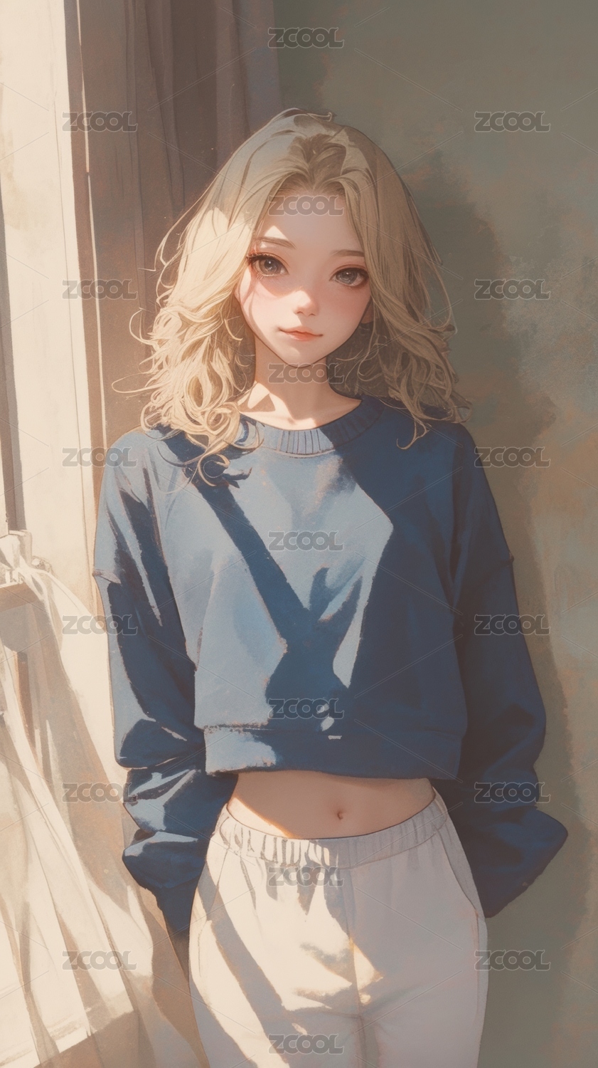 长发,室内,微笑,阳光,休闲,青春,明亮,金发,蓝色,女孩