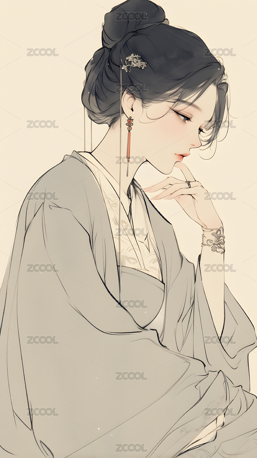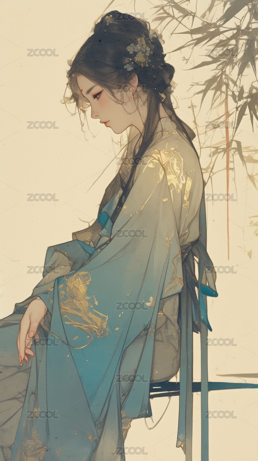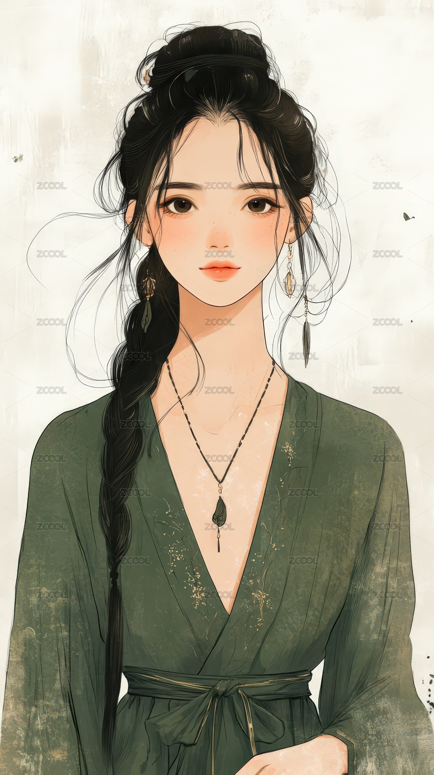 卡通,插画,动漫,漫画,长发,肖像,绿色,古典,女子,发饰