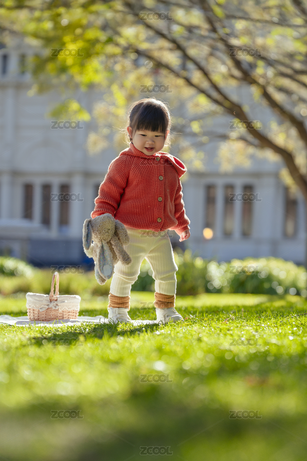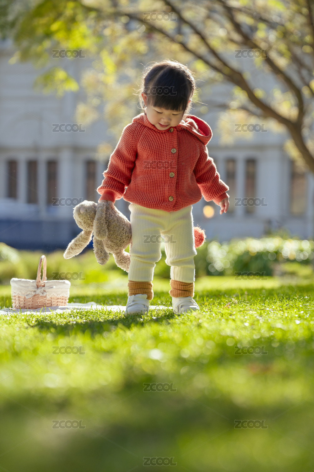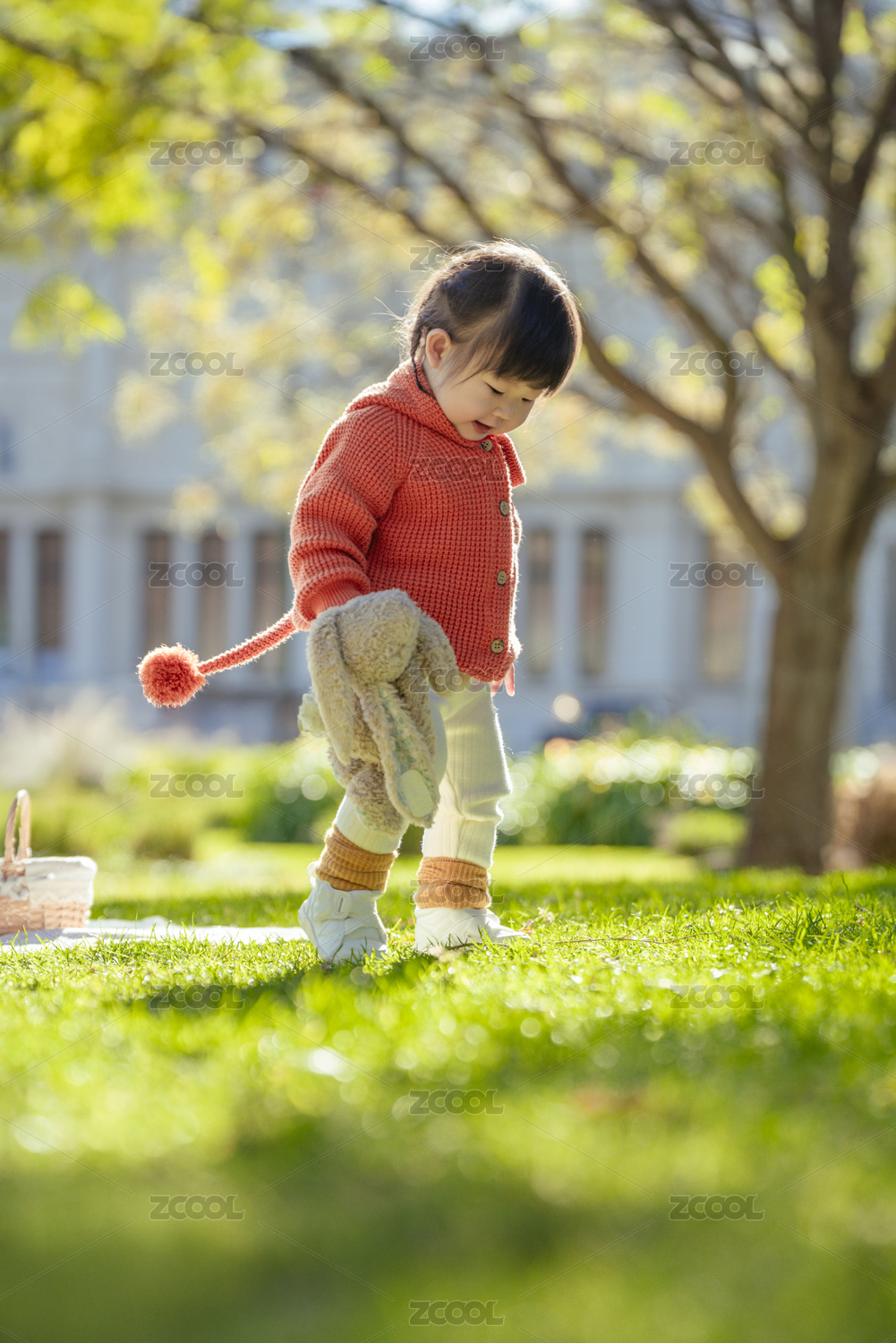 博物馆树前草坪上手拿布偶玩乐的可爱小女孩