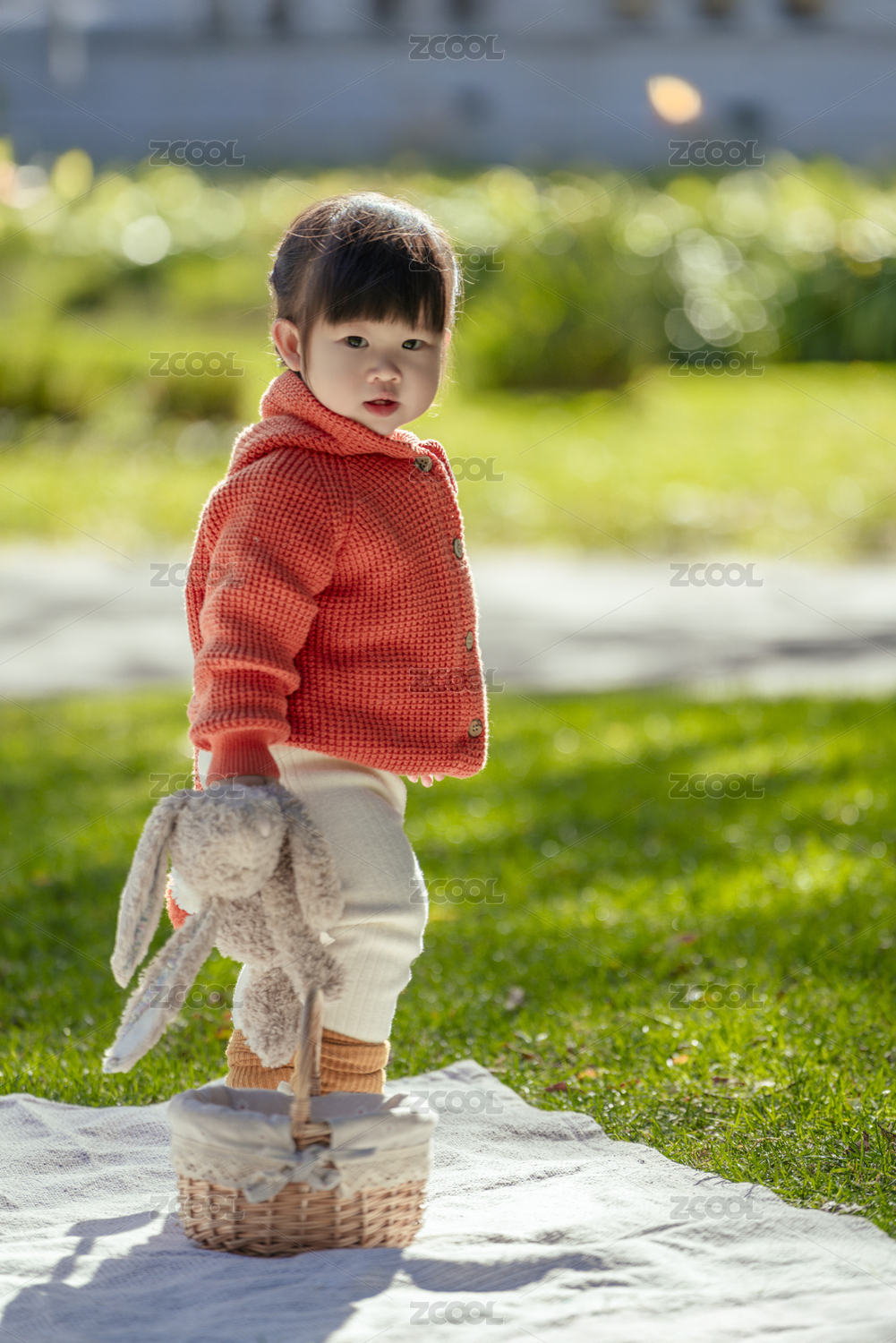 站在花园草坪垫上手拿乖乖兔布偶的小女孩